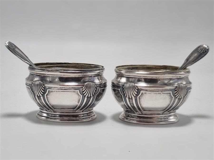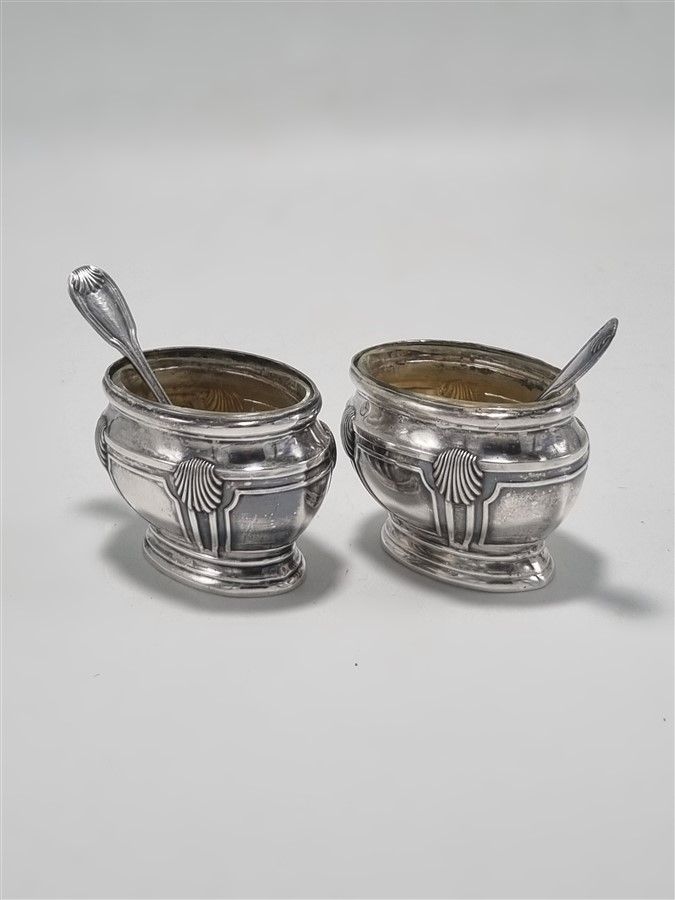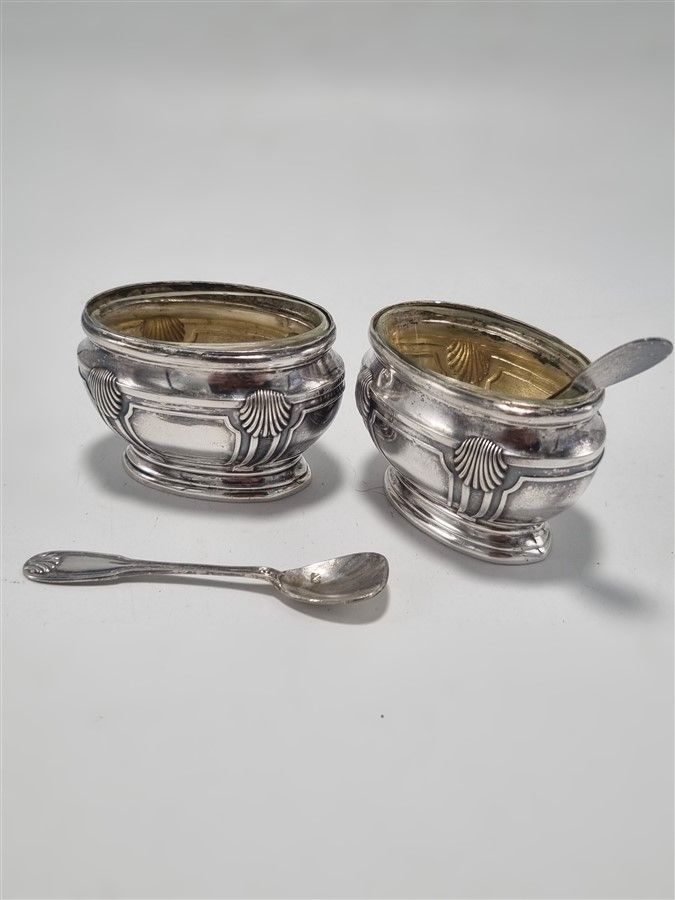 Paire de salerons en argent avec les verres intérieurs et les cuillères.