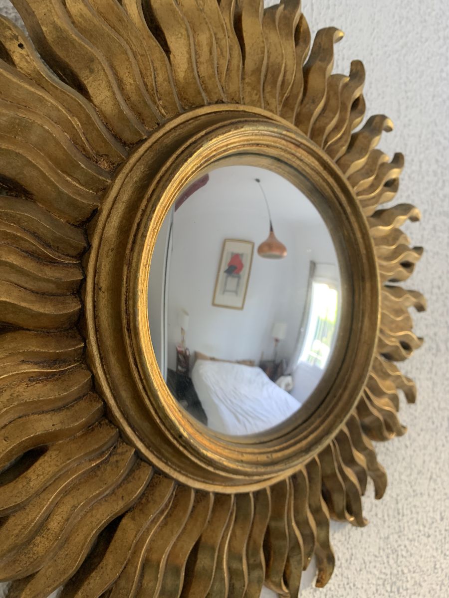 Ancien miroir soleil sorcière français en résine doré à la feuille d'or vintage 1960 en bon état.
