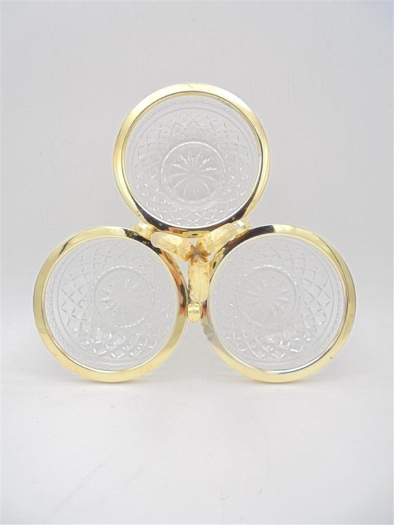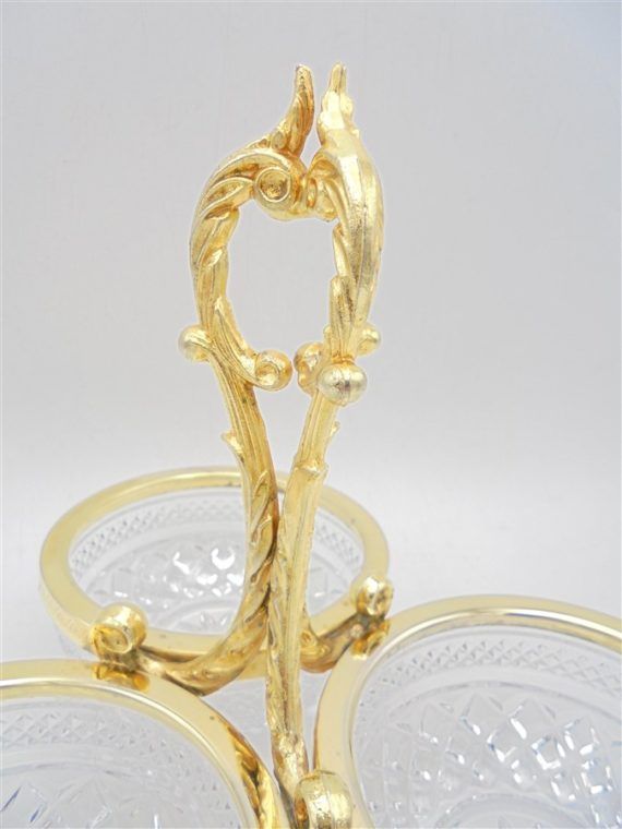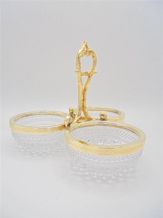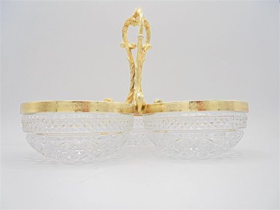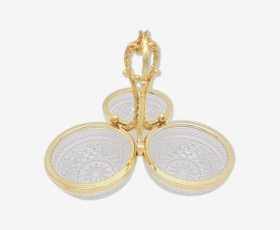 Serviteur 3 compartiments en cristal, poignée en métal de couleur dorée comportant de discrets débuts d'oxydation.