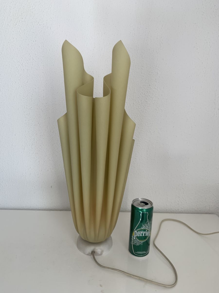 Ancienne lampe de table Athéna design Georgia Jacob “luminaire haute couture” en résine drapée couleur vert amande et socle en marbre blanc circa 1970 en bon état.