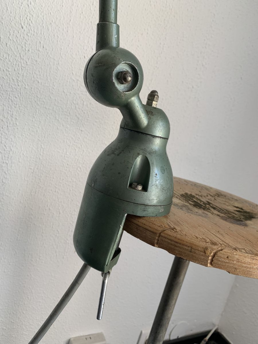 Lampe industrielle usine Jieldé en métal laqué vert métalisé circa 1960 en bon état, tout est d'origine y compris l'étau de serrage.