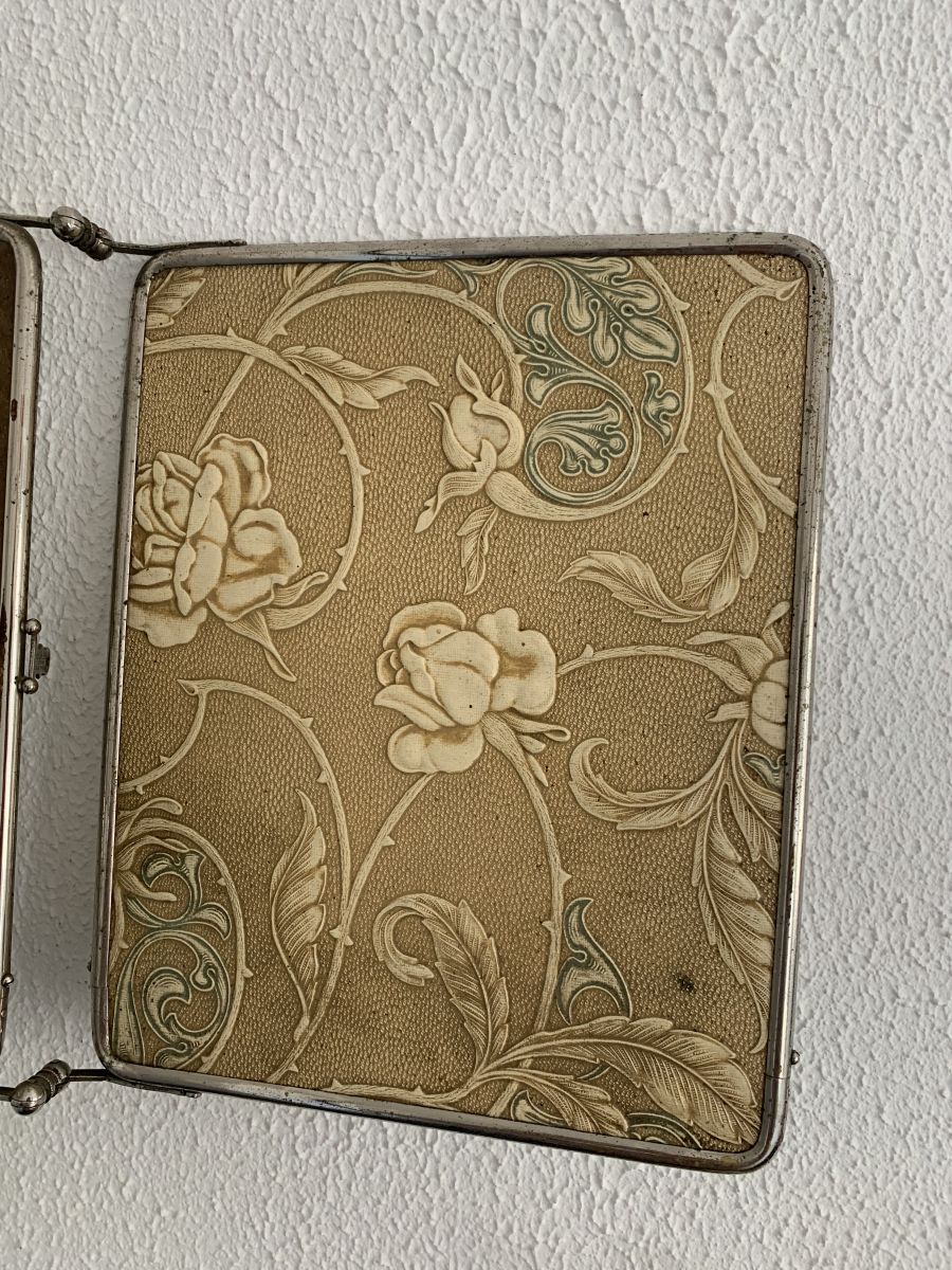 Le cadre nickelé affiche une très belle patine, il est signé "déposé GB PARIS" sur le fermoir, les charnières lourdes décalées sont solides et raffinées.