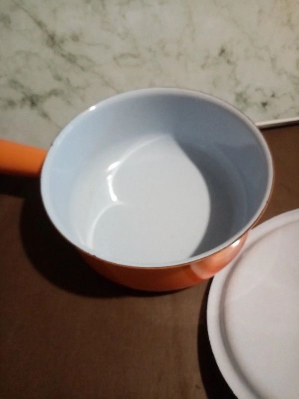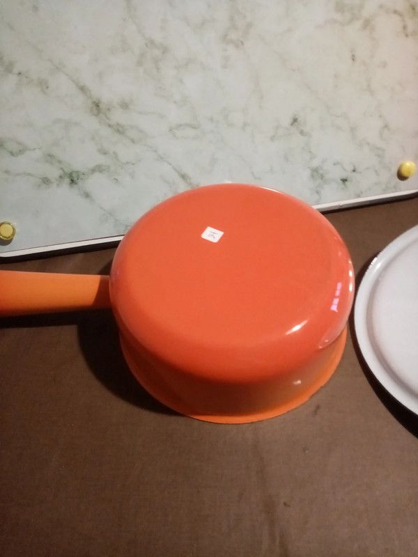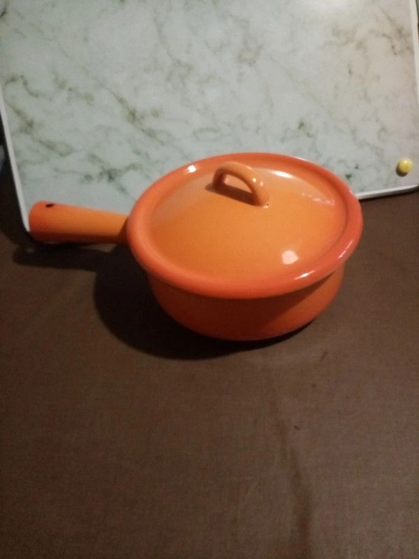 Casserole en émail, orange, avec son couvercle, 17 cm de diamètre, 7 cm de hauteur, en parfait état