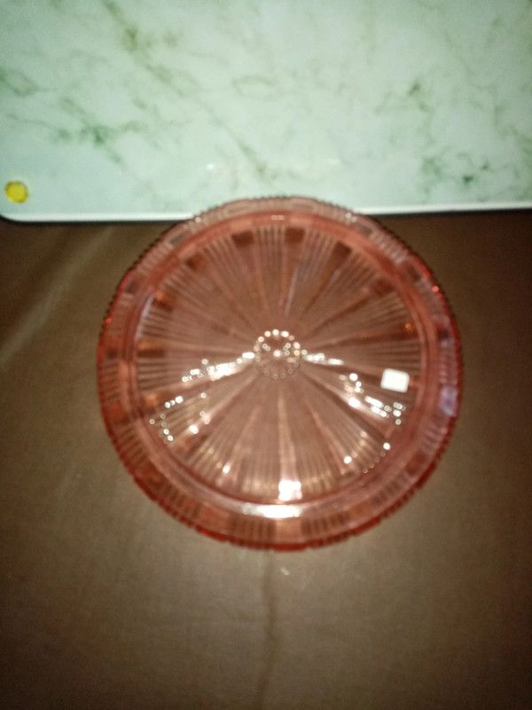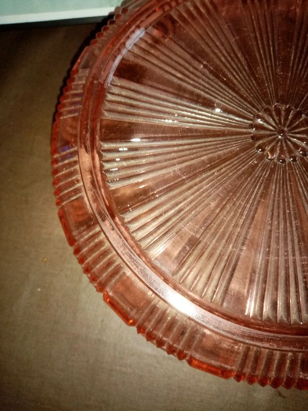 Coupe vintage rose, 20 cm de diamètre, 5 cm de haut, en verre avec motif rosace. En bon état