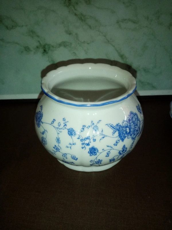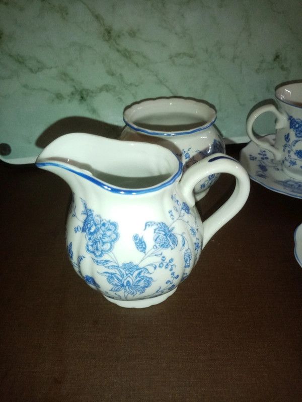Ensemble à café comprenant 2 tasses à café avec leurs sous tasses, un sucrier et un pot à crème, motif fleurs bleues, porcelaine véritable en très bon état
