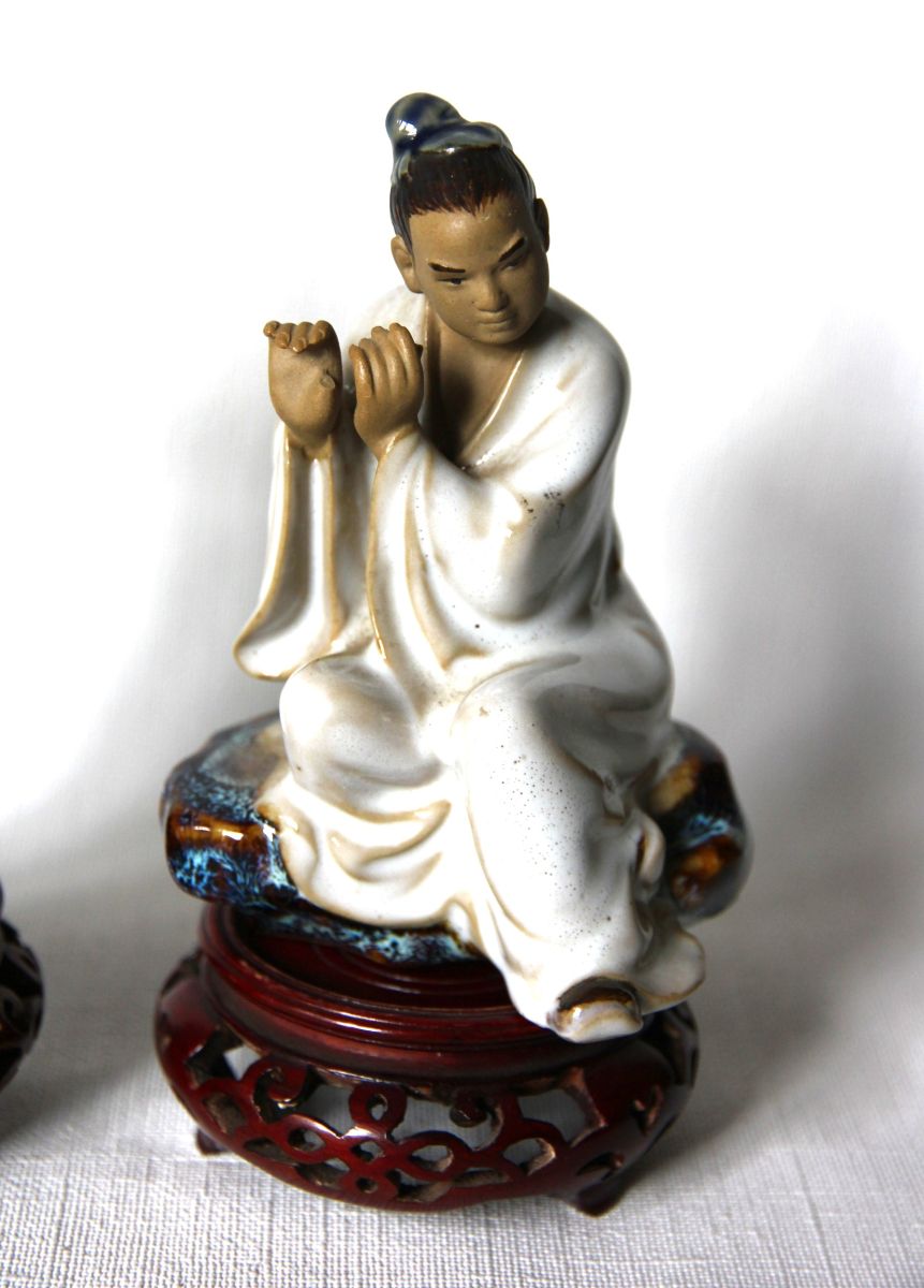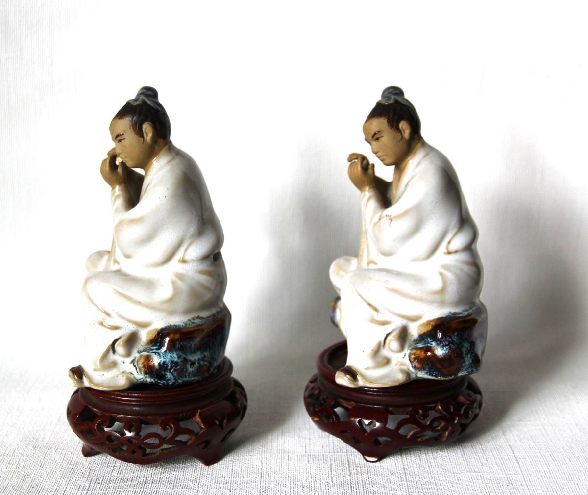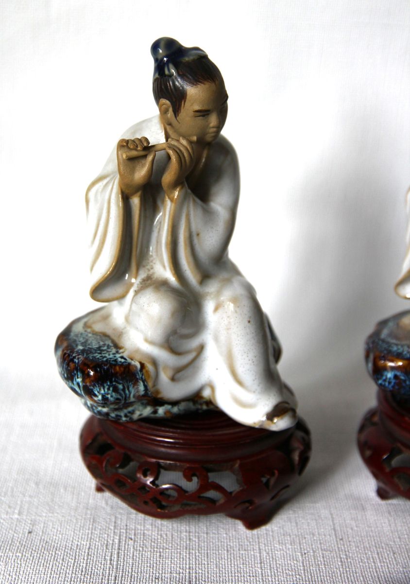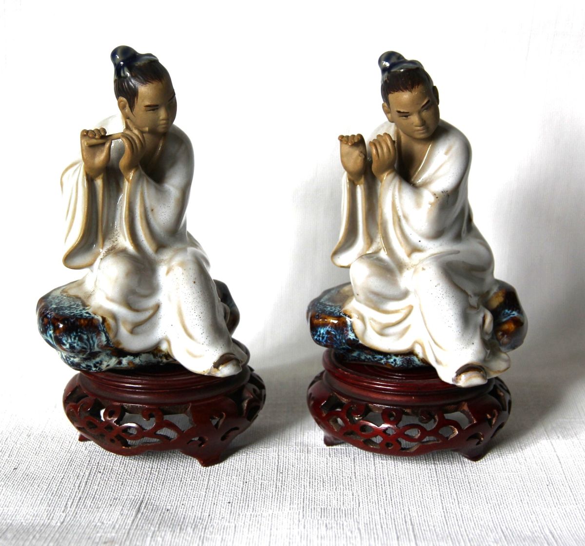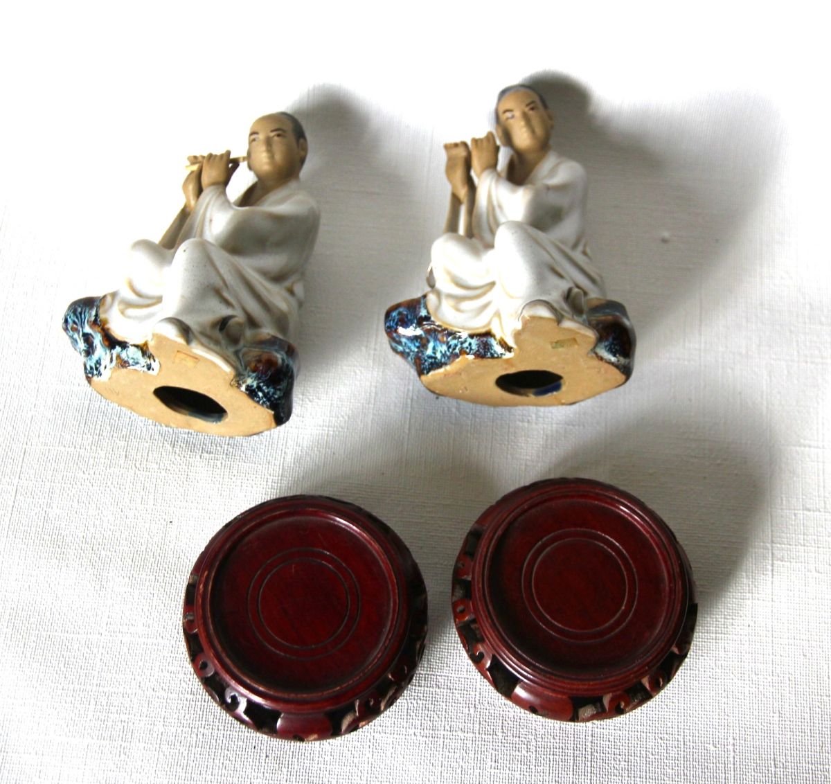 Lot de 2 joueurs de flute, musiciens asiatiques chinois vintage.