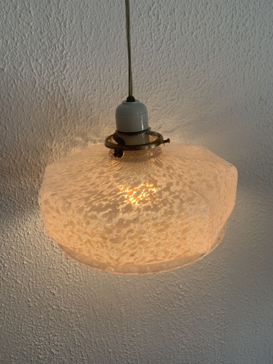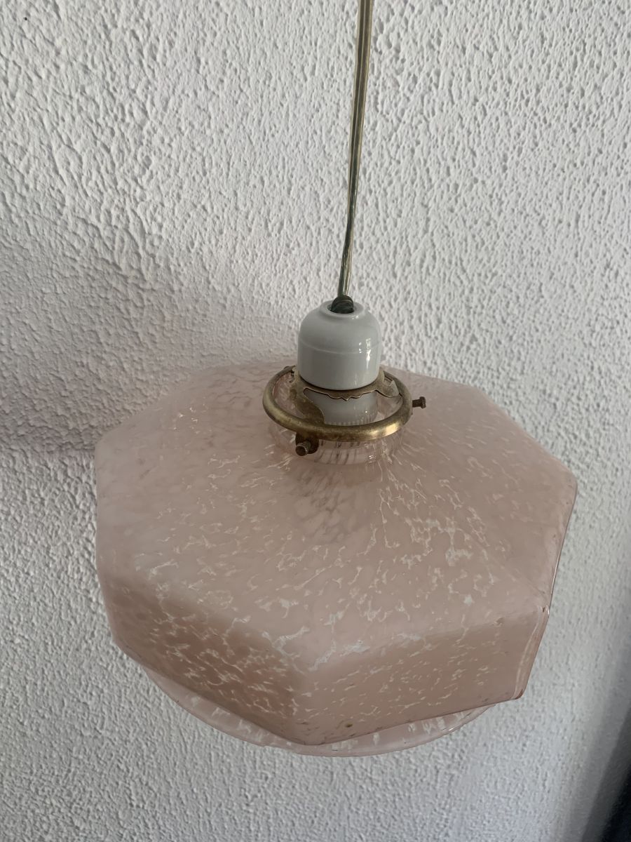 Ancienne suspension en verre rose nuage, porcelaine et laiton circa 1930 en bon état.