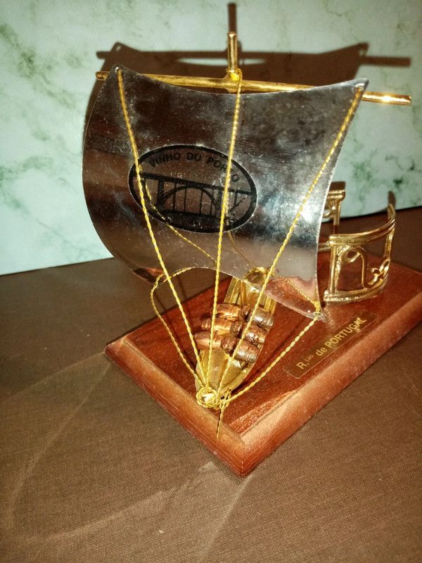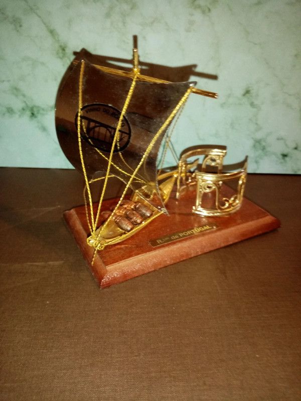 Souvenir de Porto Caravelle, Caravelle dorée sur support en bois, 13x8x12cm. En très bon état