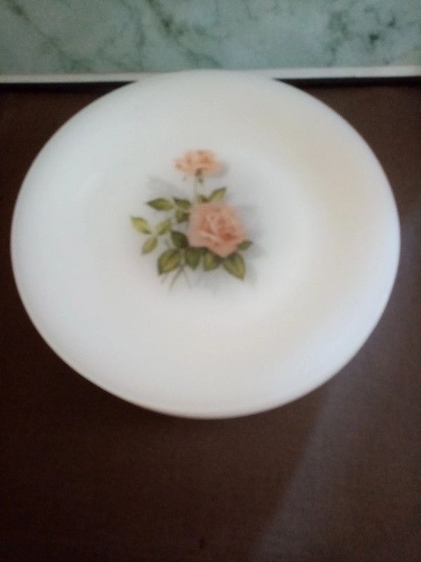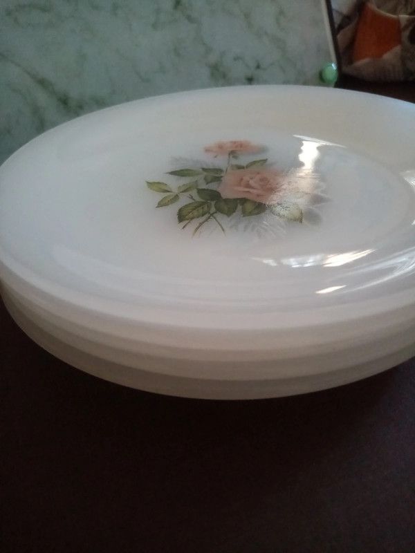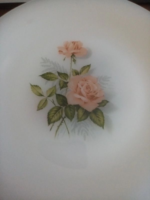 5 assiettes à dessert en arcopal, motif roses, 19 cm de diamètre, en très bon état