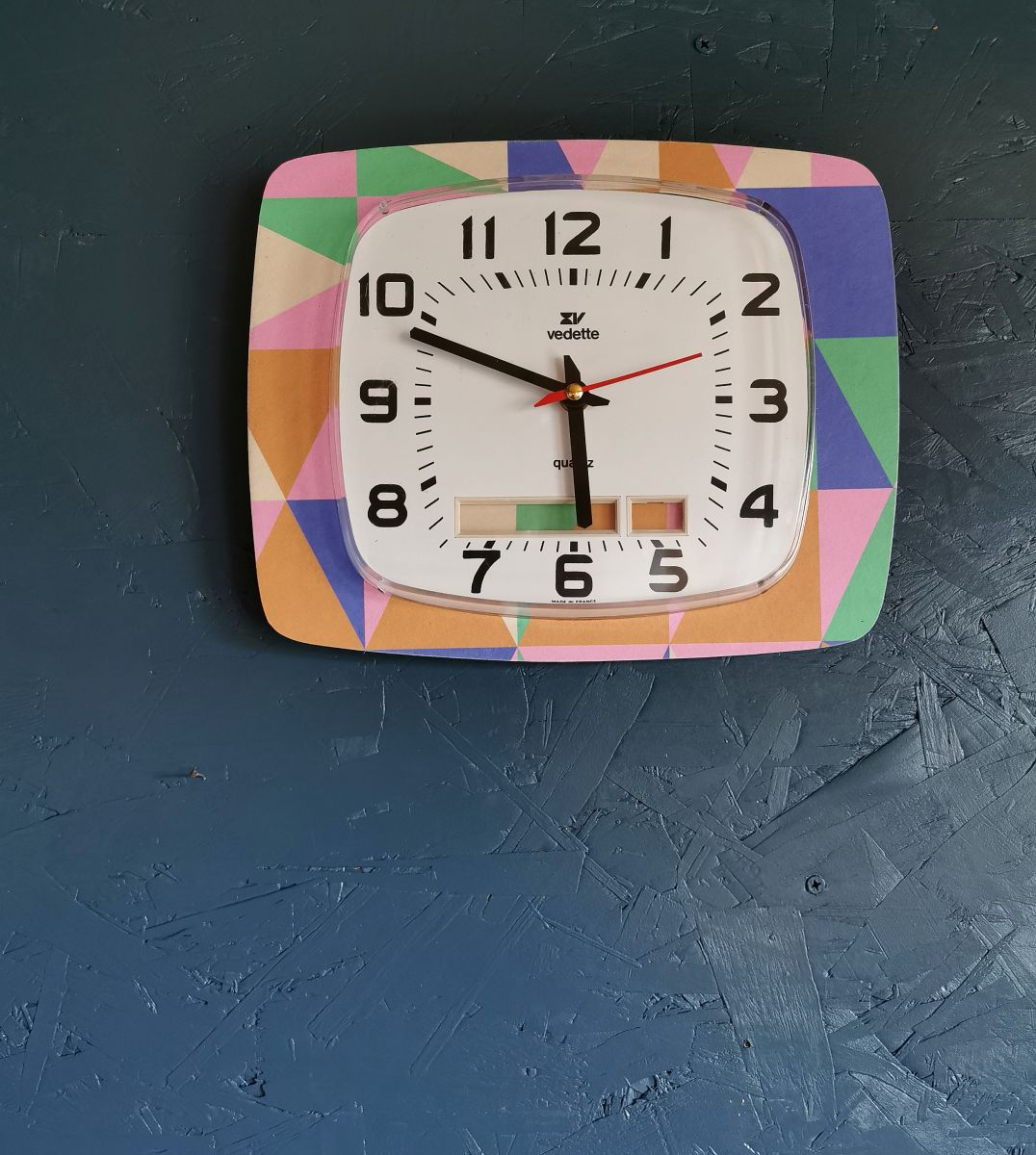 Horloge vintage pendule murale silencieuse années 70 "Vedette rose vert bleu"