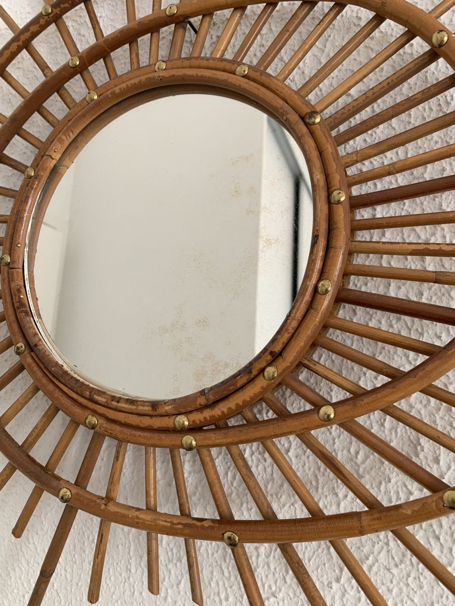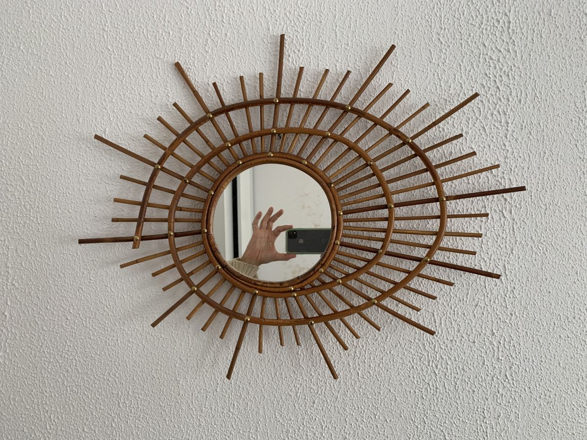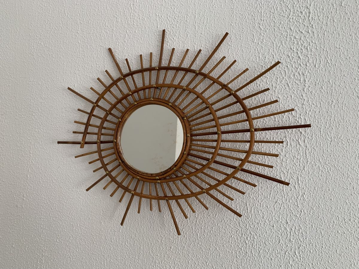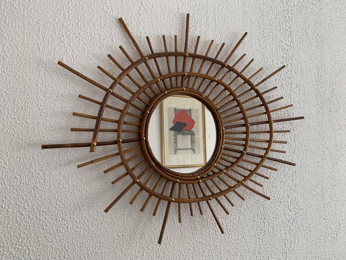 Miroir vintage 1960 soleil rotin osier ORTF spirale design -