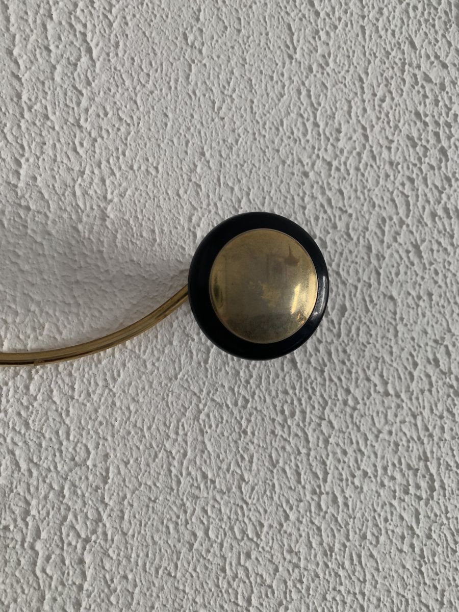 Ancien portemanteau à 3 patères en métal doré et métal laqué noir circa 1960 en bon état. Un autre modèle identique porte la mention porte la mention “doré à la feuille” sur une étiquette posée sur l’une des patères (photos par mail sur simple demande).
