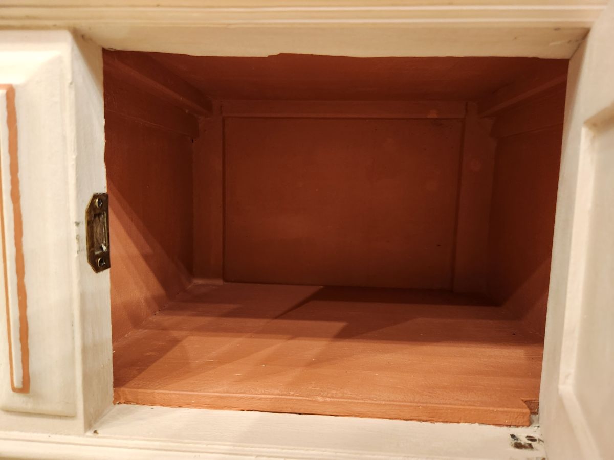 Ce petit meuble vintage a été entièrement relooké à la main, dans deux teintes de rose douces et lumineuses, avec une peinture à la craie écologique et des finitions à la cire. Il comporte un tiroir en haut, une porte en bas, et une niche centrale ornée d’un ruban peint — symbole discret mais puissant de solidarité et de résilience.