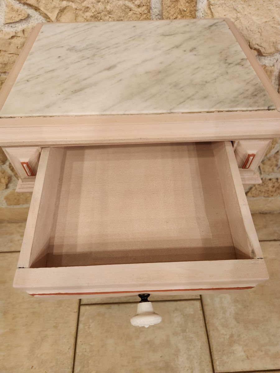 Son dessus en marbre véritable, aux veinures naturelles, apporte une touche noble et intemporelle à l’ensemble. Il contraste avec la douceur des teintes et renforce le caractère unique de la pièce.