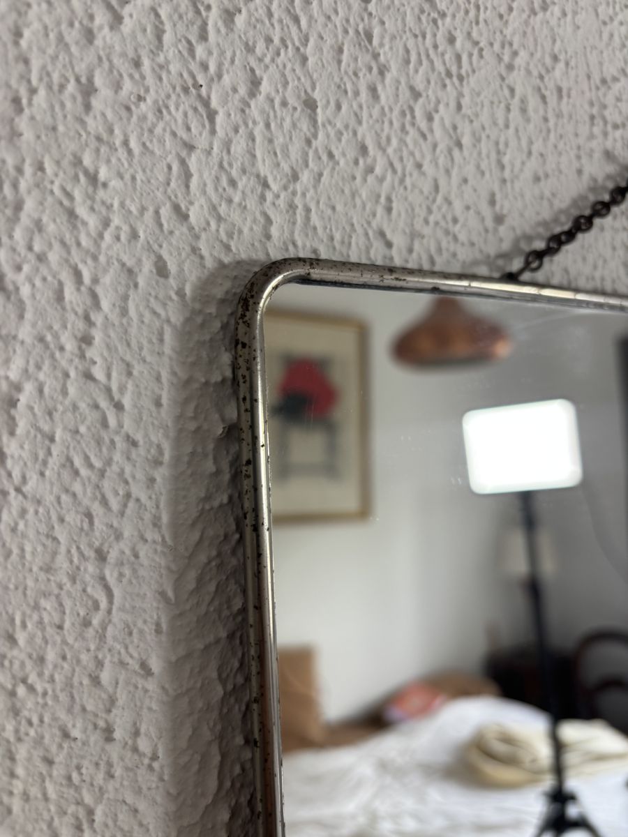 La glace est propre, le cadre en métal chromé est piqué, le dos en carton est marqué .