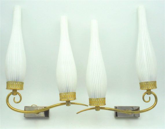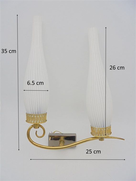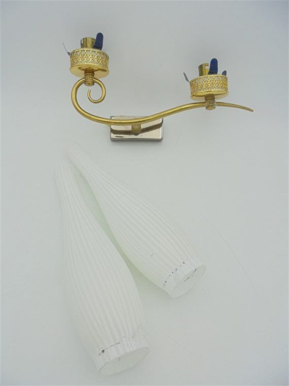 Paire d’ appliques murales, la structure est en laiton et les globes sont en verre blanc.