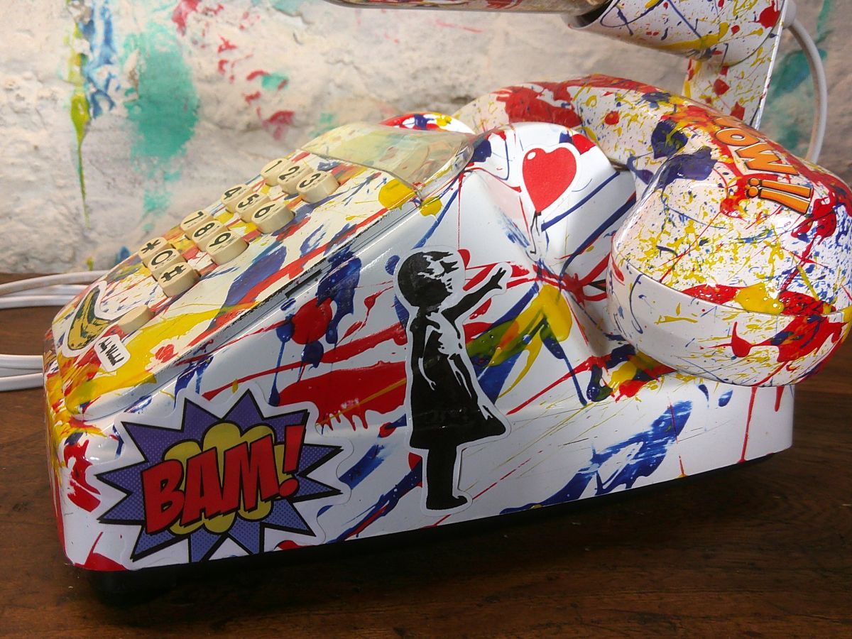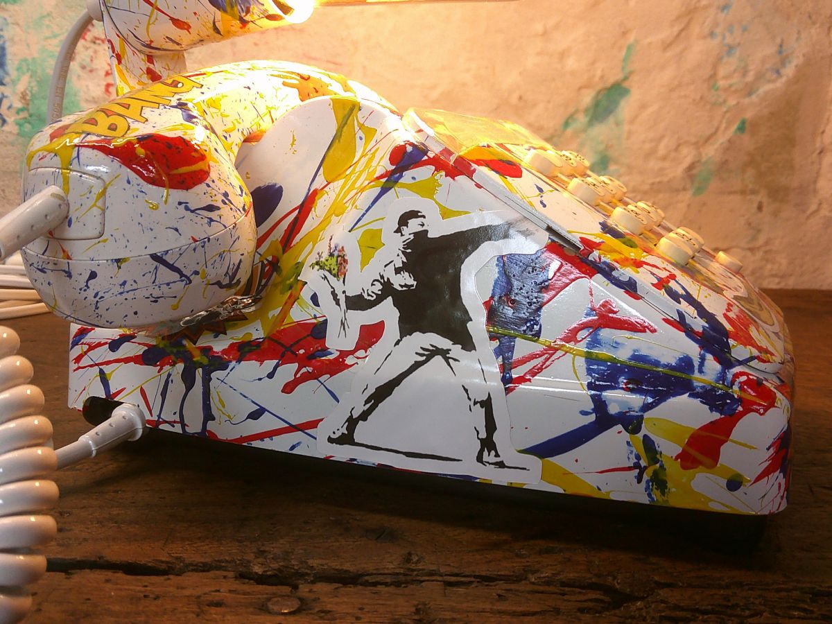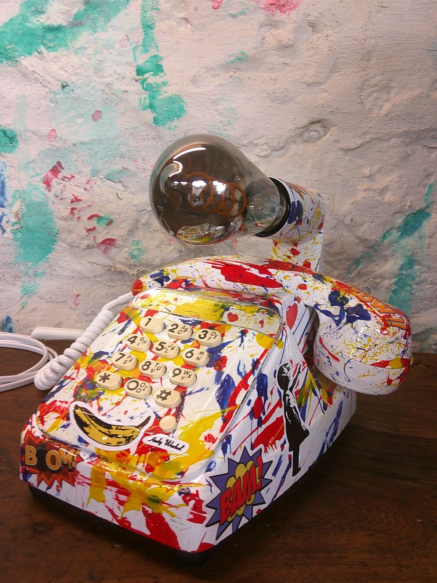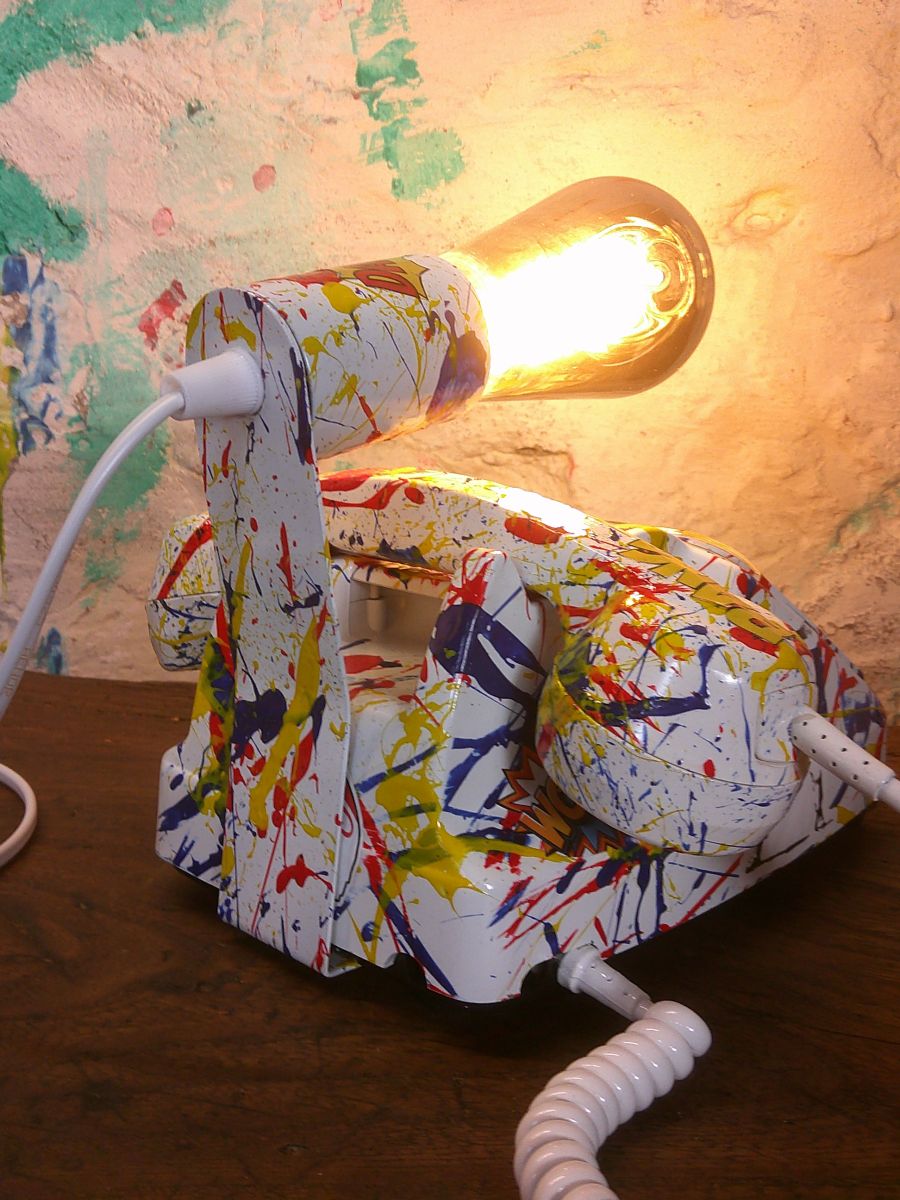 Lampe téléphone a touche vintage customisée blanc avec projection 3 couleurs .