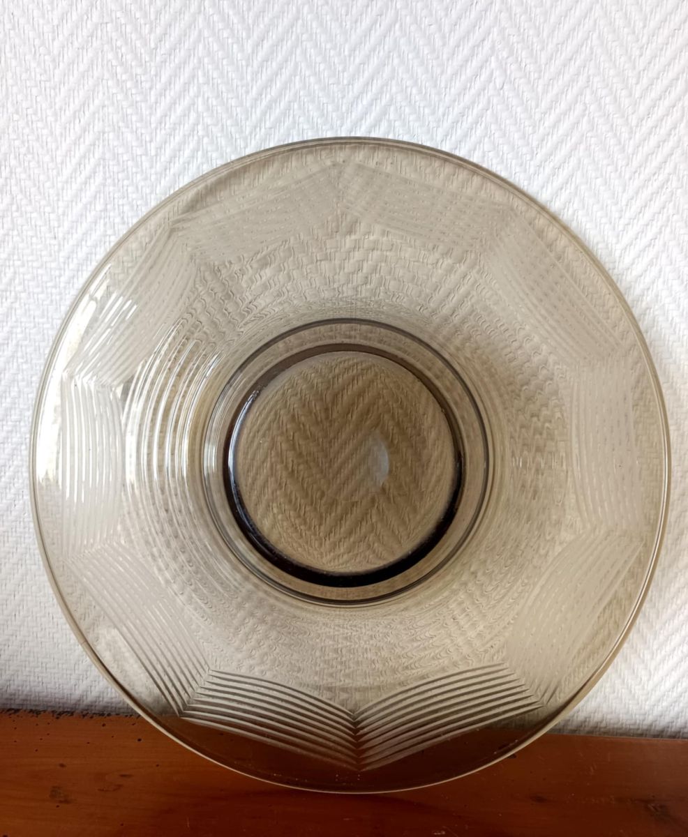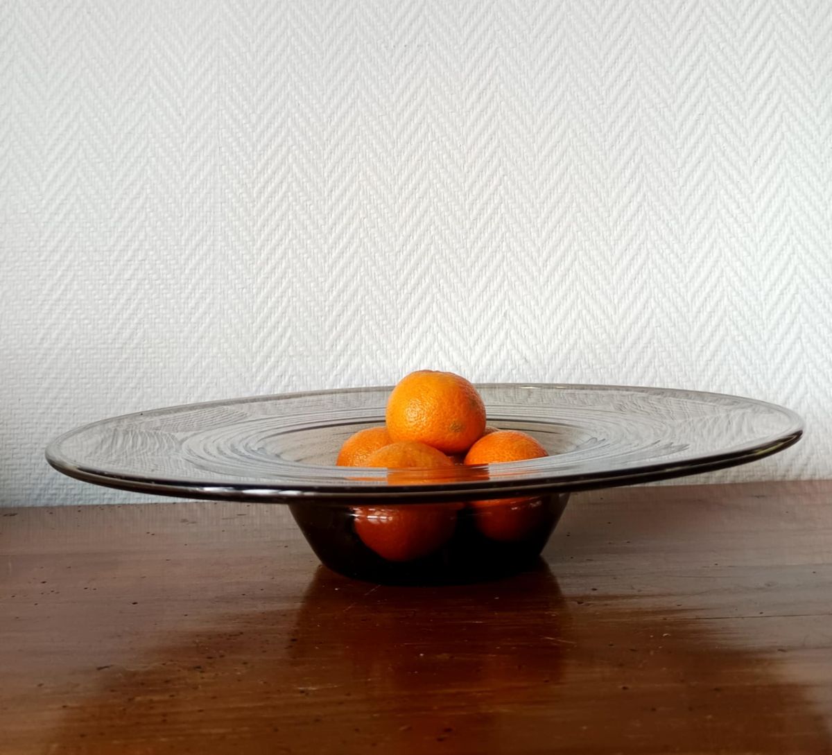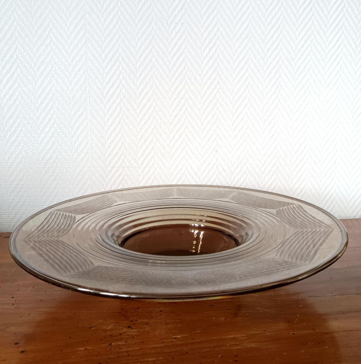 Grande coupe à fruits de forme ronde en verre fumé, de style art déco. Décor de formes géométriques en relief au revers.