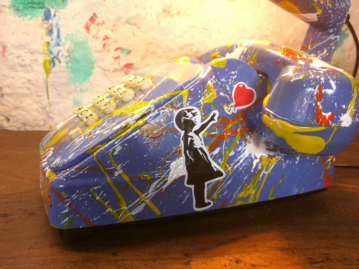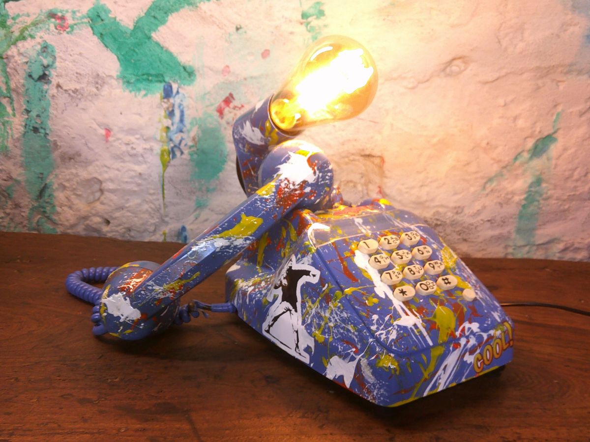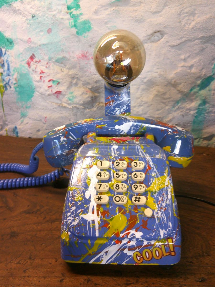 Lampe téléphone a touche vintage customisée bleu avec projection 3 couleurs .