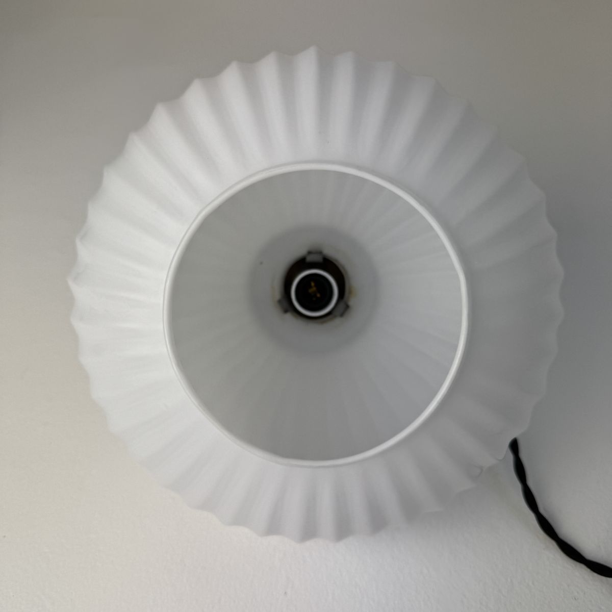 Electricité neuve avec fil noir en tissu torsadé. Prête à brancher par domino. Douille à vis gros culot (ampoule E27) et rosace de fixation en bois.