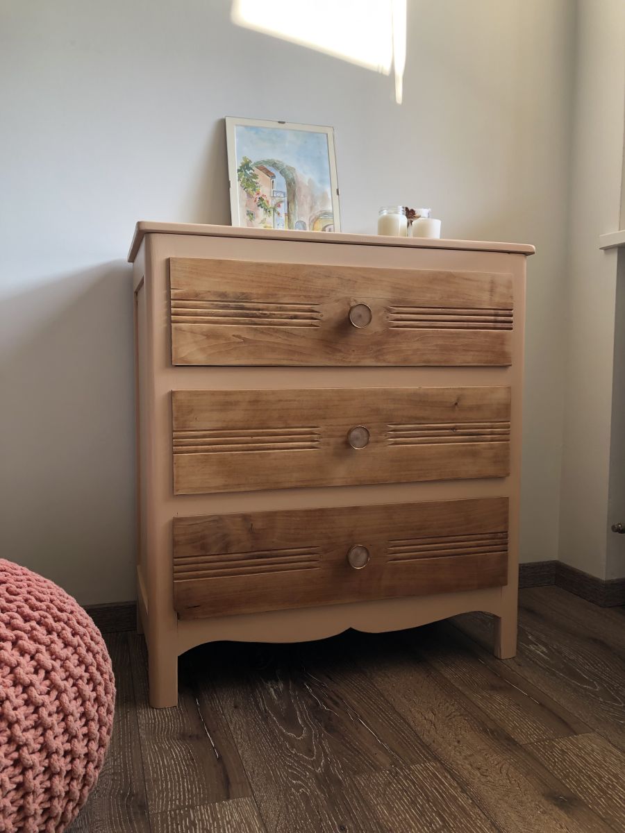 Entièrement poncer et traité contre les vrillettes, cette ancienne commode a retrouvé une belle allure avec sa couleur pêche. (Fared terracotta F&B)