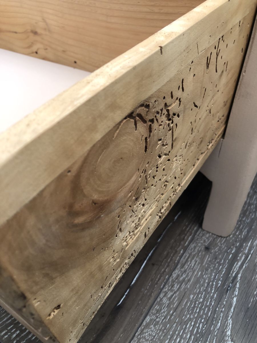 Ses tiroirs en bois verni, laissent apparaître la déco naturelle des vrillettes sur le côté d’un des tiroirs. (voir photo)