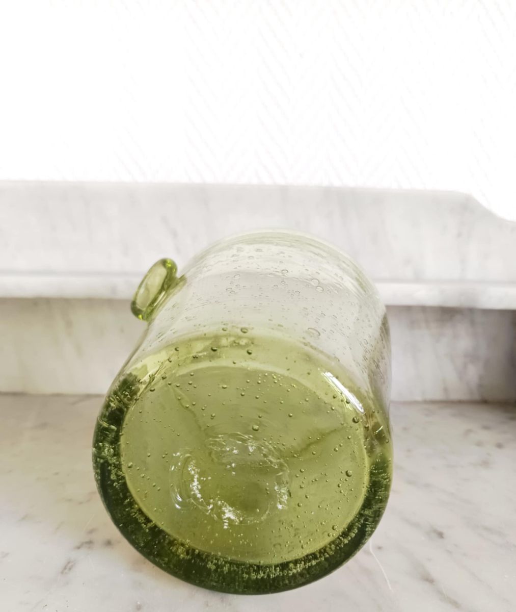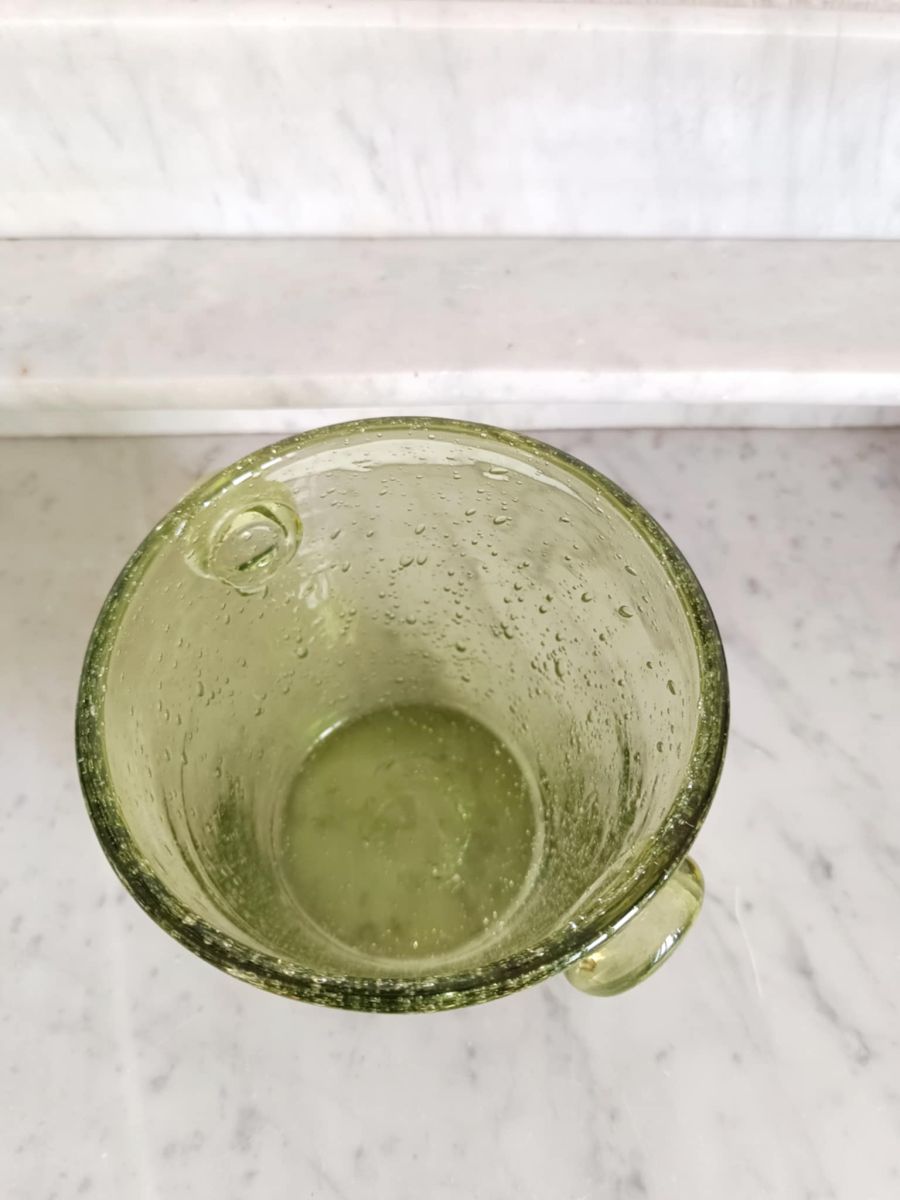 Seau à glace en verre bullé de couleur vert avec deux prises latérales. Dans le style des créations des verreries Biot mais non signé.