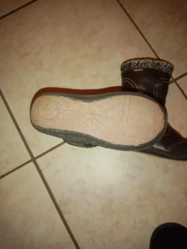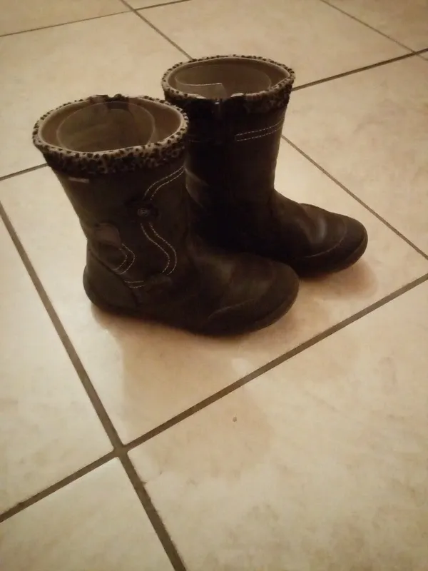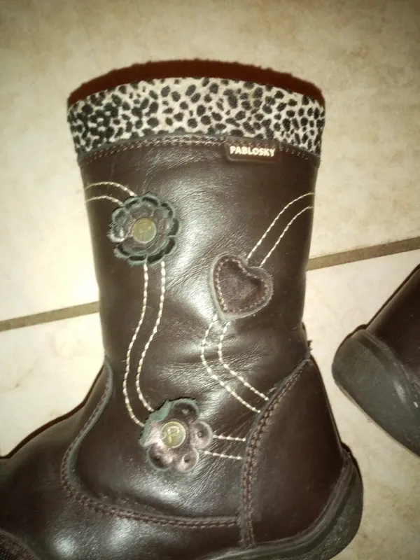 1 paire de bottines Pablosky, en cuir marron foncé avec bordure léopard, taille 27, hauteur de tige 15 cm, en très bon état