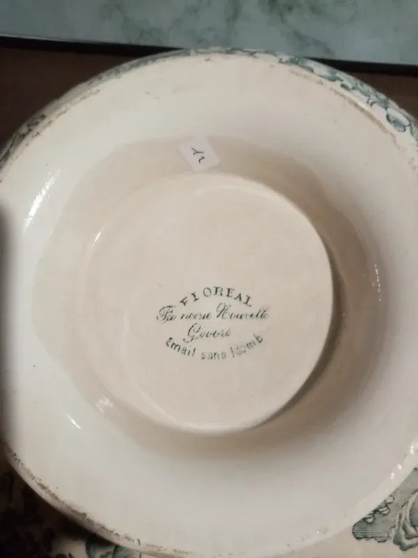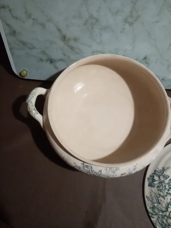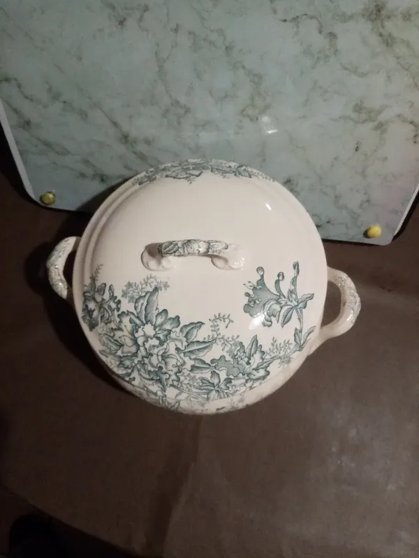 Très belle soupière faïence de Givors, motif verdure bleu canard, avec son couvercle, le tout en très bon état, juste quelques tâches de vieillesse (voir photo)