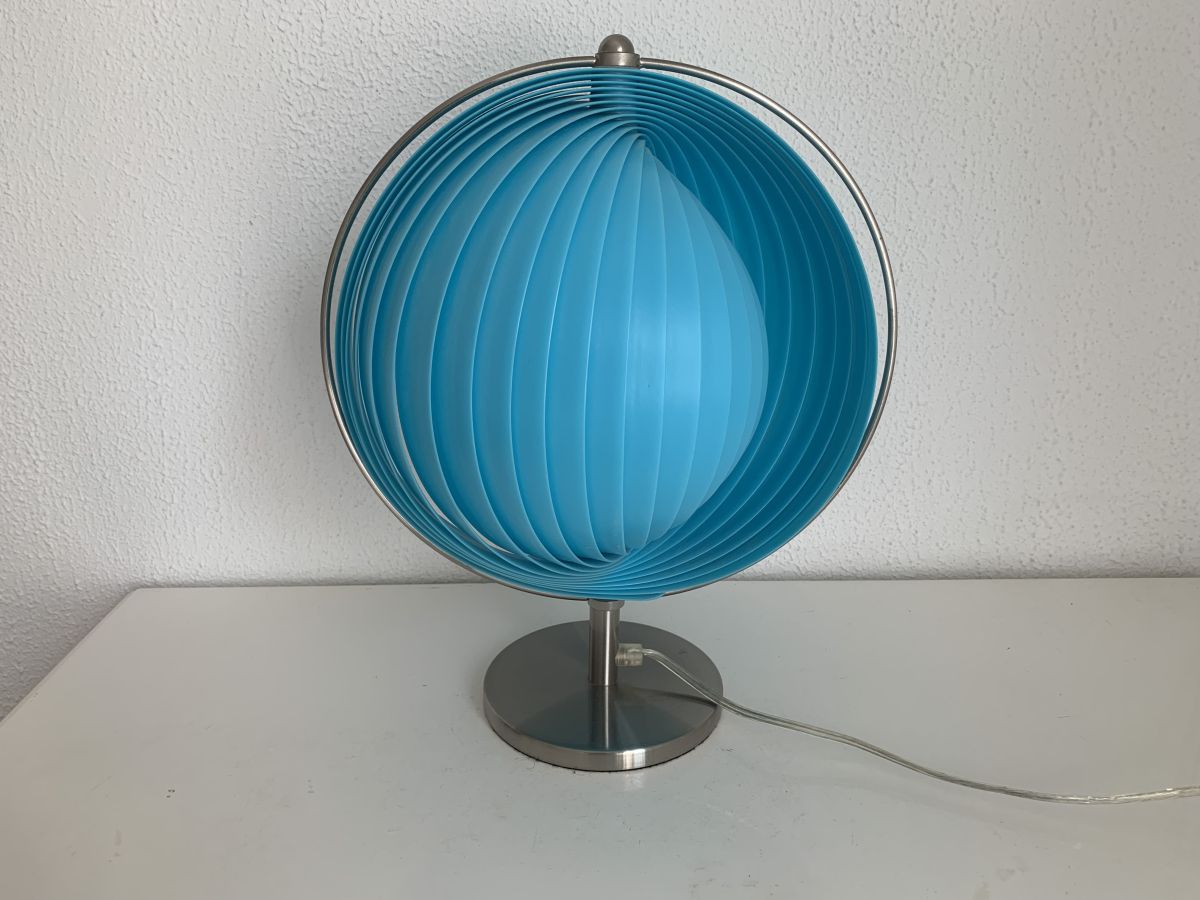 Ancienne LAMPE espagnole de la marque KARE en PVC bleu et métal chromé dans le goût de la lampe Moon de Verner Panton éditée chez Louis Poulsen cicra 1980 en bon état.