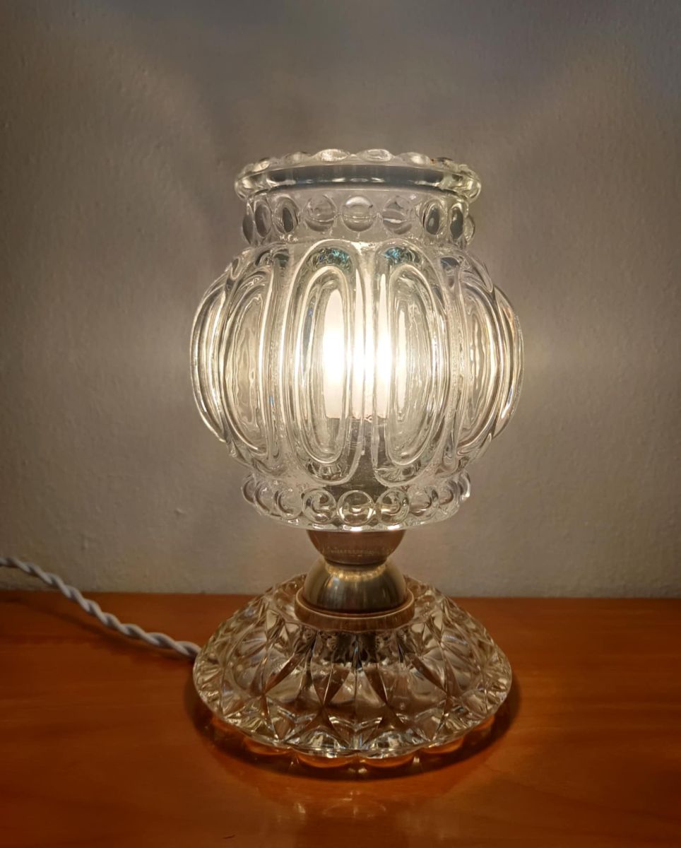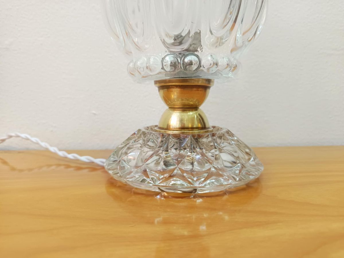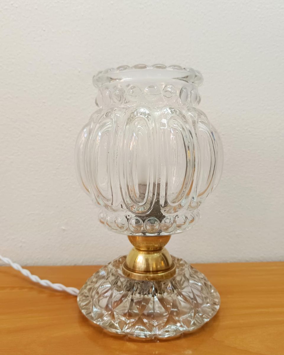 Petit lampe à poser de style art déco, composée d'un socle en verre moulé type cristal, un globe en verre moulé avec effet bulles et une monture en laiton.