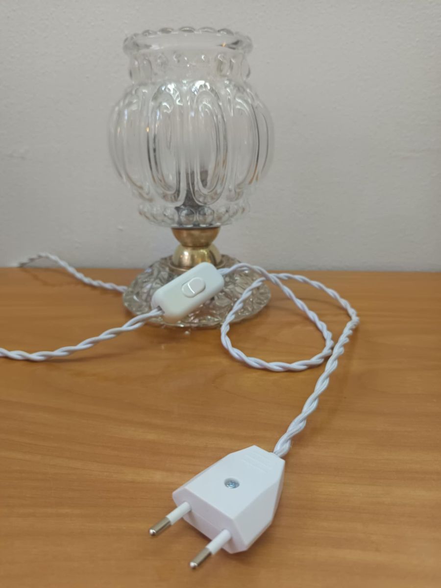 Electrification propre et fonctionnelle : douille culot B22, fil électrique en tissu torsadé blanc, bouton d'allumage et prise de couleur blanche également.