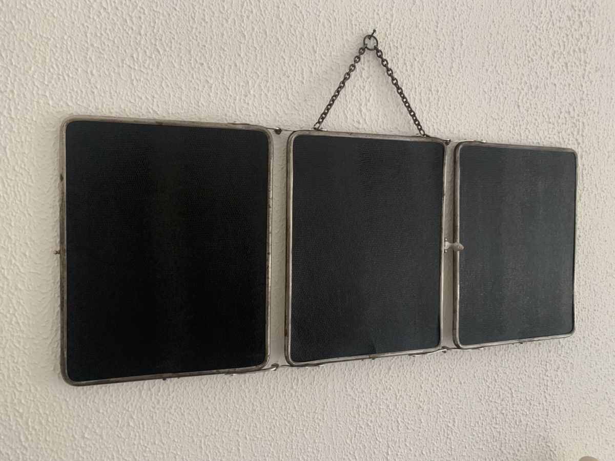 Ancien miroir triptyque de barbier en métal chromé et dos en simili lézard noir circa 1950 en bon état.