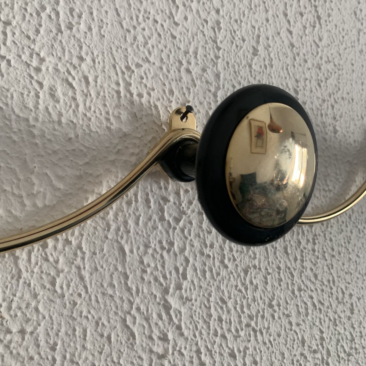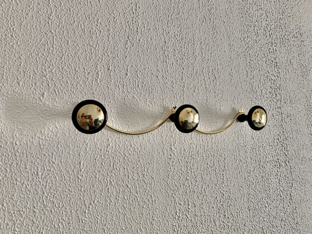 Ancien portemanteau à 3 patères en métal doré et métal laqué noir circa 1960 en état neuf.