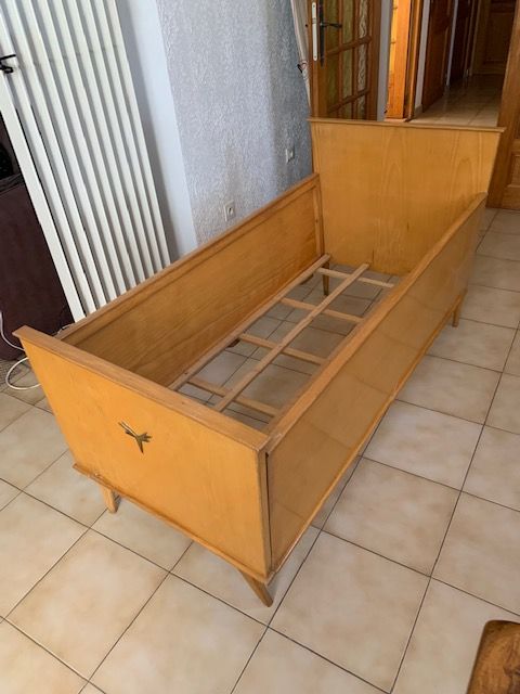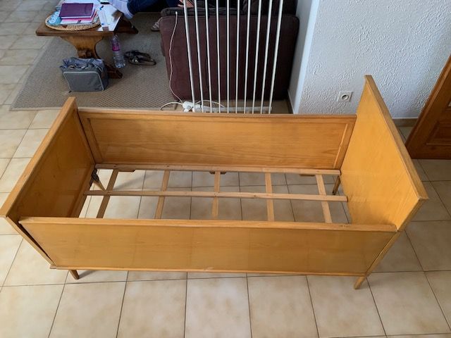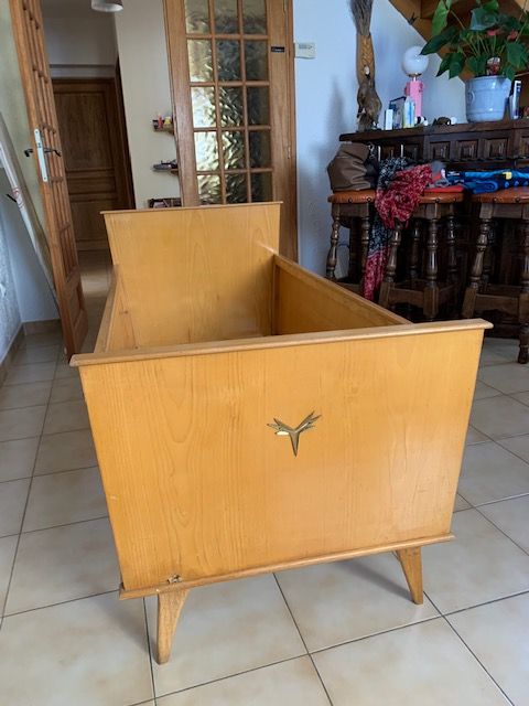 LIT enfant de 1963, n'a servi que trois ans puis a été conservé dans un grenier au sec , il est en bon état, un pied a été refait suite à rupture, la face avant est orné d'une pièce en laiton qui rappelle une tête de cerf, voir photo 1