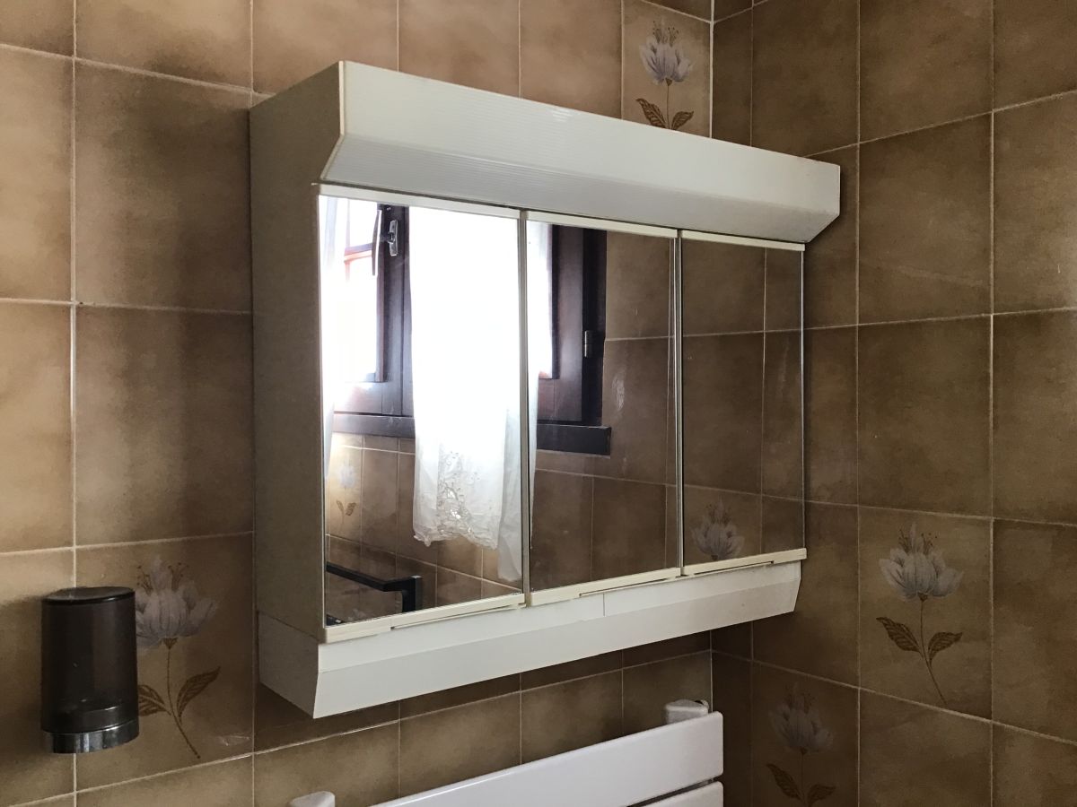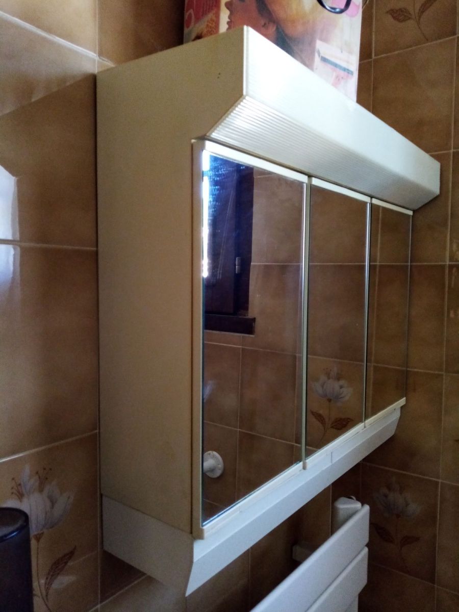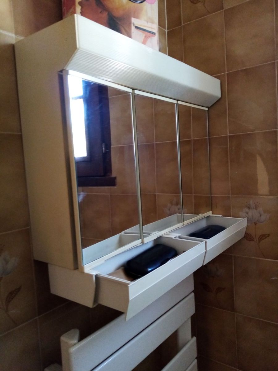 Armoire à pharmacie années 60, en plastique blanc avec 3 petites portes à miroir , 2 tiroirs en partie basse, bandeau lumineux en partie haute à raccorder ou pas