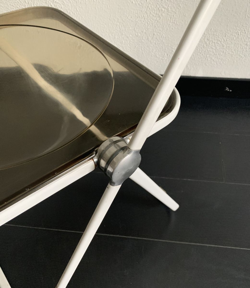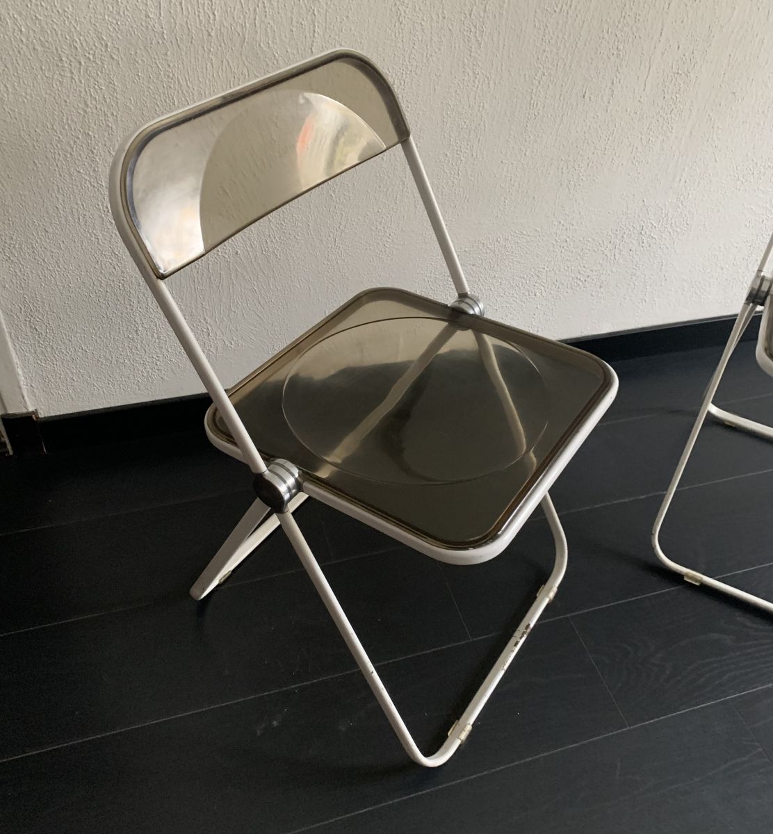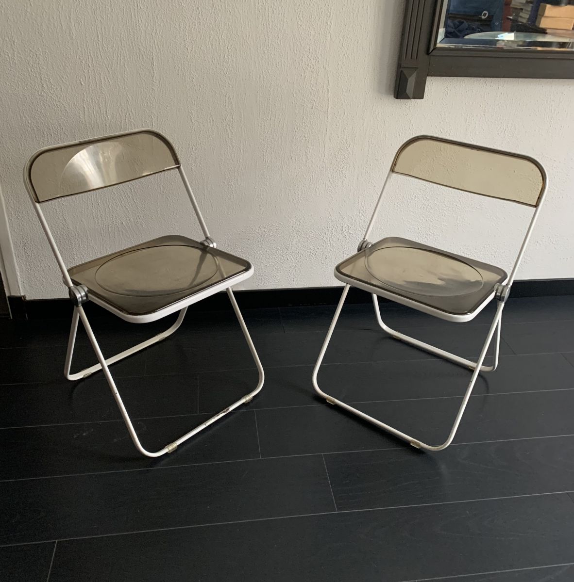 Paire d'anciennes chaises pliantes en perspex fumé et métal laqué blanc modèle Plia design Giancarlo Piretti éditées par la firme italienne Anonima Castelli circa 1960 en bon état.