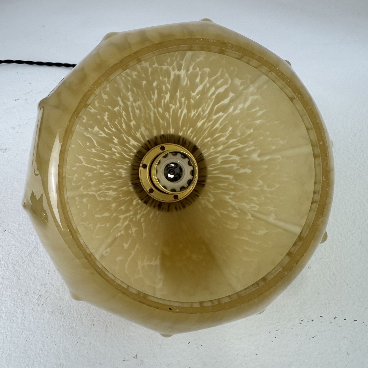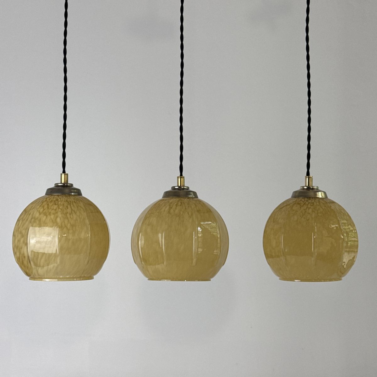 Trio de 3 magnifiques suspensions en verre de Clichy ambré. En très bel état. Bel effet de lumière. Rosace de fixation en métal.