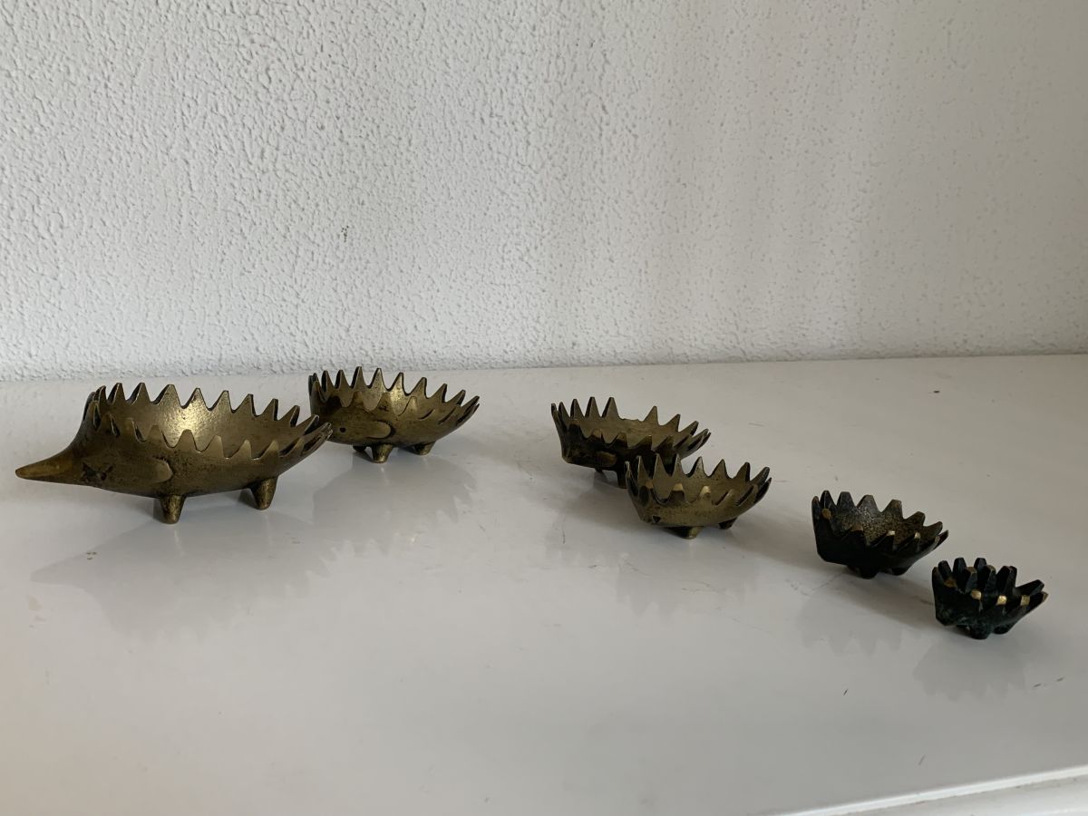 Très bel ensemble de cendriers famille de hérissons gigognes par Walter Bosse en laiton édités par Hertha Baller circa 1950 en bon état.