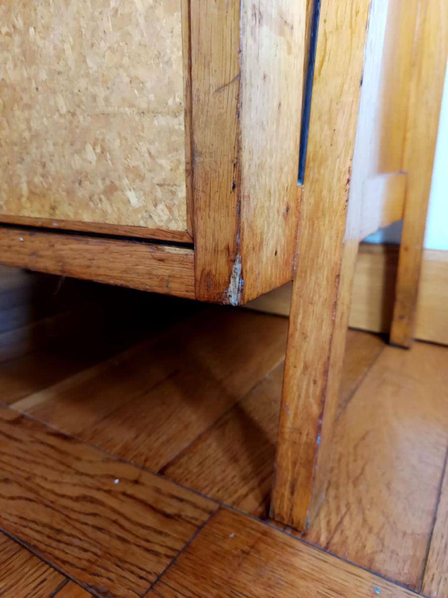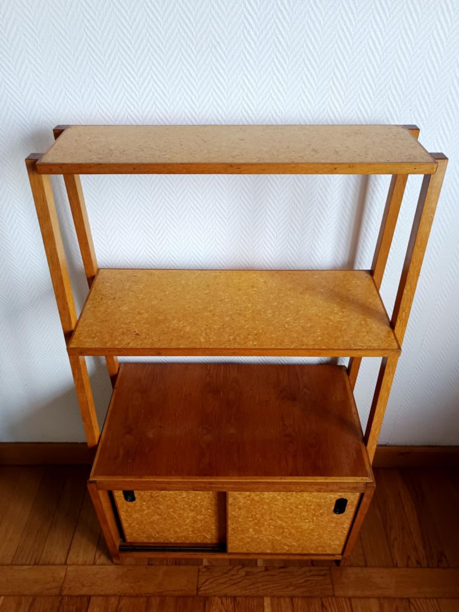 Bibliothèque ou étagère reposant sur quatre pied en bois clair. Deux étagères en bois pressé et un caisson avec deux portes coulissantes également en bois pressé ouvrant sur une étagère.