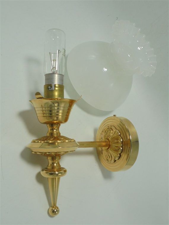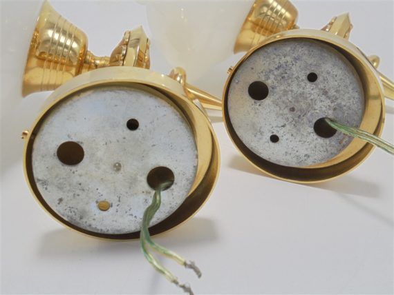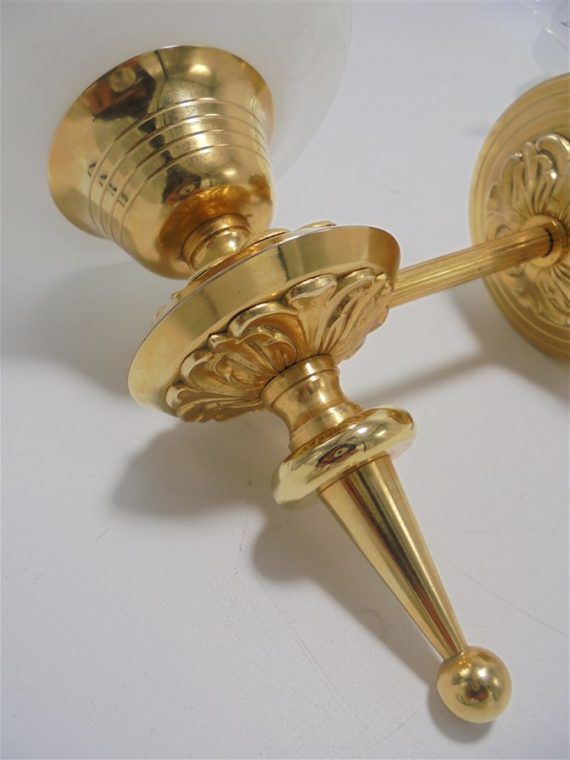 Luxueuses appliques murales en laiton (ou bronze?) doré et globes en opaline épaisse.