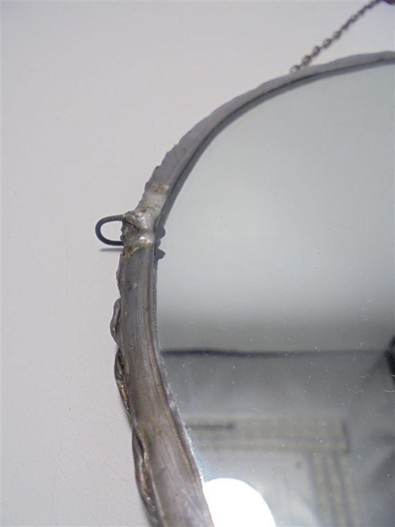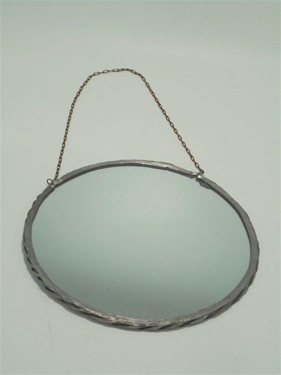 Petit miroir rond de style barbier, à suspendre grâce à sa chaînette (rouillée...), son contour est en plomb.