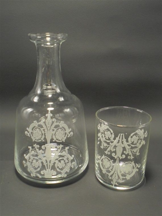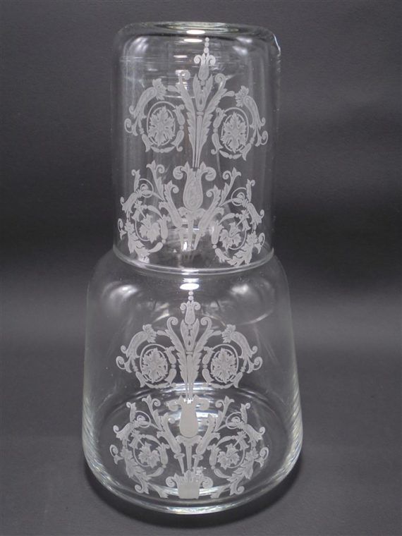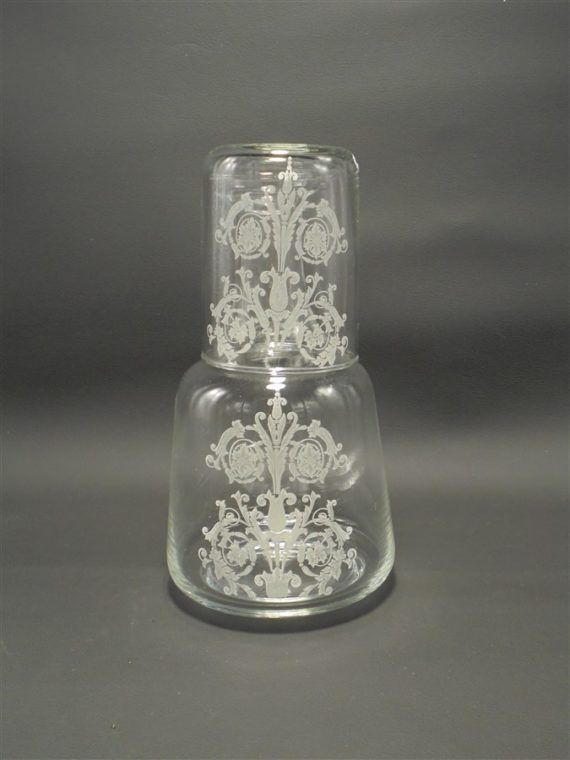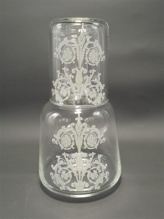 Service de chevet en verre, une jolie carafe et un gobelet pour les soifs nocturnes.