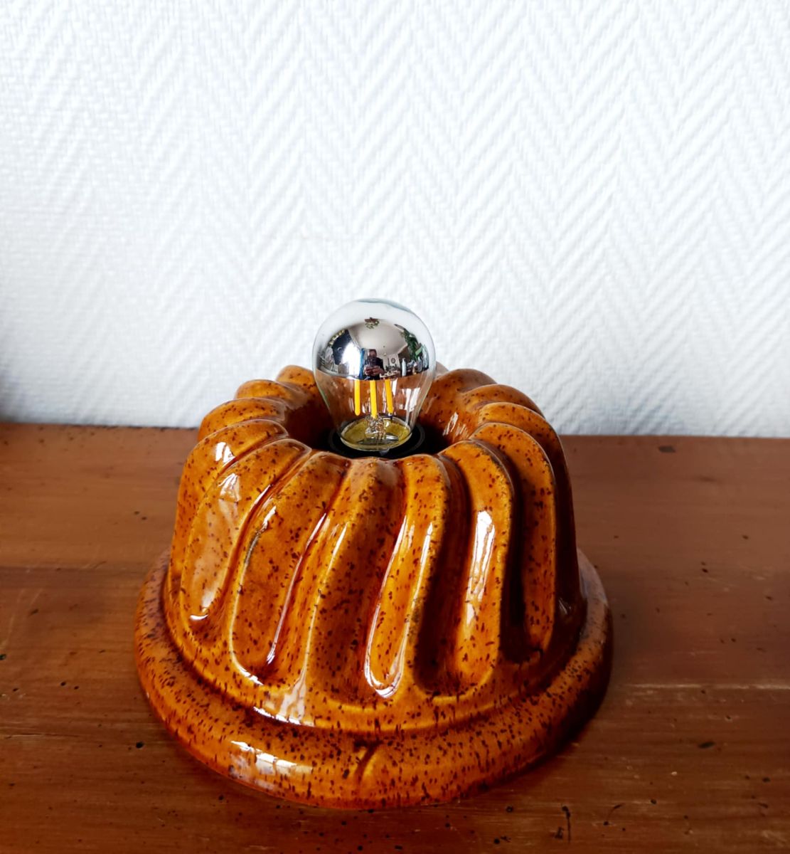 Lampe à poser composée d'un moule à gâteaux vintage en céramique marron, monté à l'électricité : douille ampoule culot E27, ampoule à tête argentée, fil électrique en tissu torsadé doré, bouton d'allumage et prise Bakélite noir. Raccord au revers avec un domino.