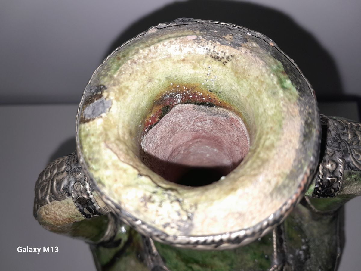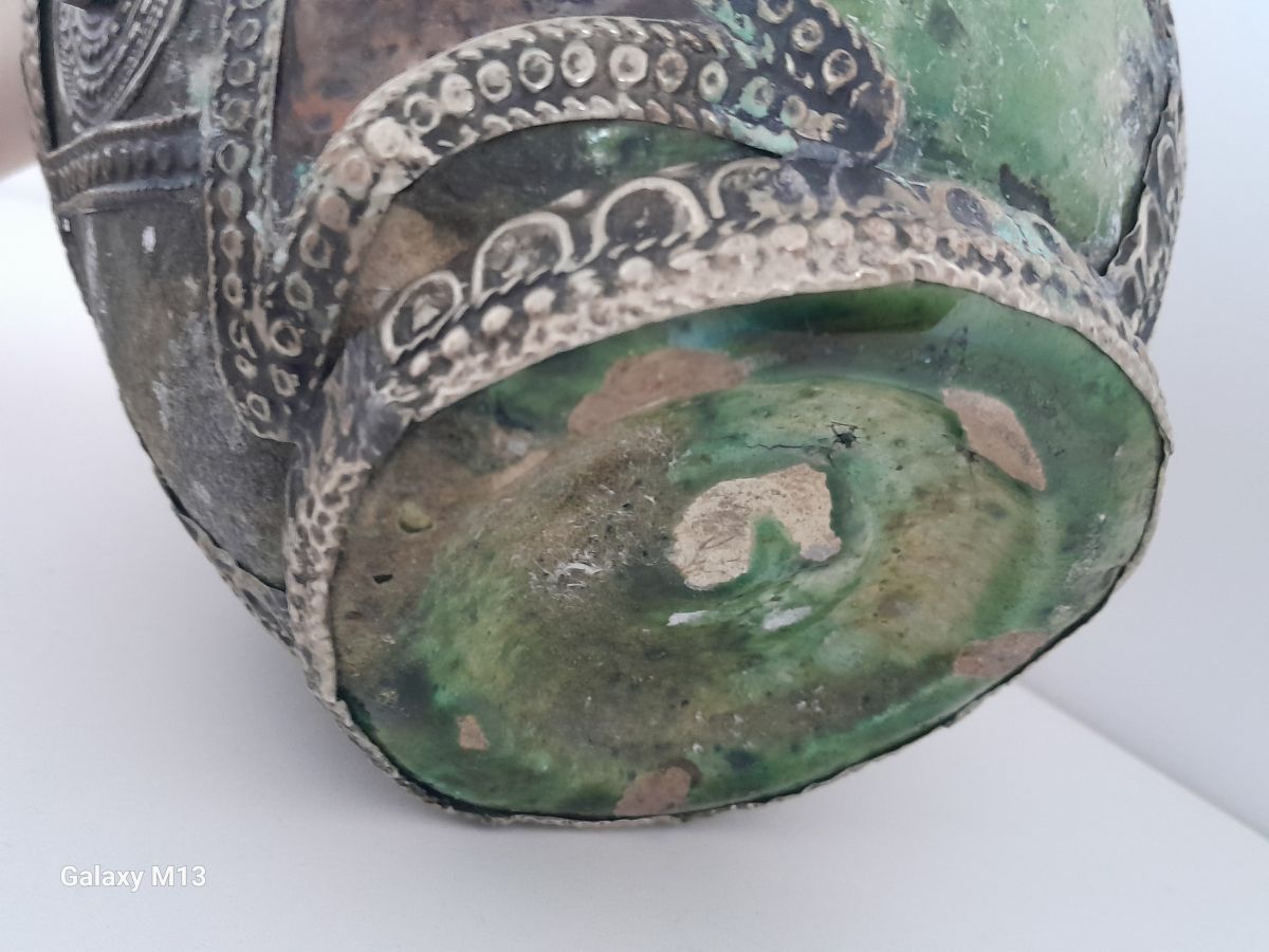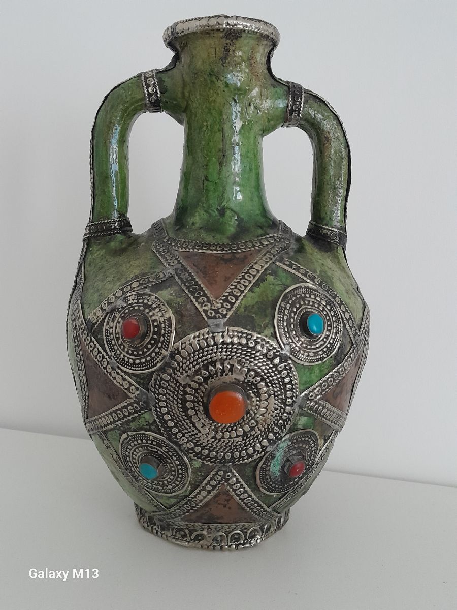 Magnifique vase oriental artisanal marocain en terre cuite, de couleur verte, décoré de métal ciselé et de pierres décoratives. Parfait pour une décoration authentique et artisanale. Remise en main propre.