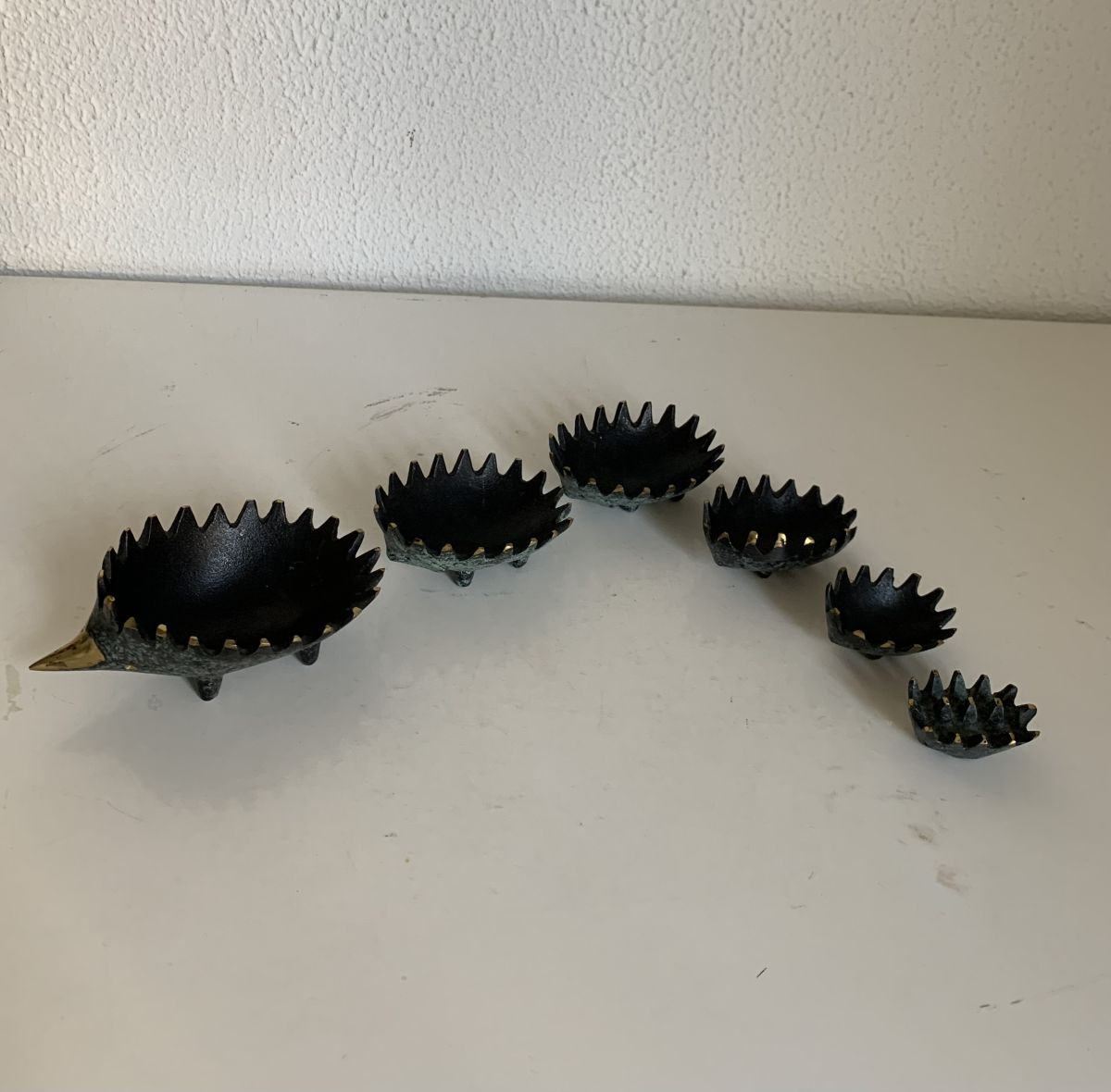 Très bel ensemble de cendriers famille de hérissons gigognes par Walter Bosse en métal patiné édités par Hertha Baller circa 1950 en bon état.