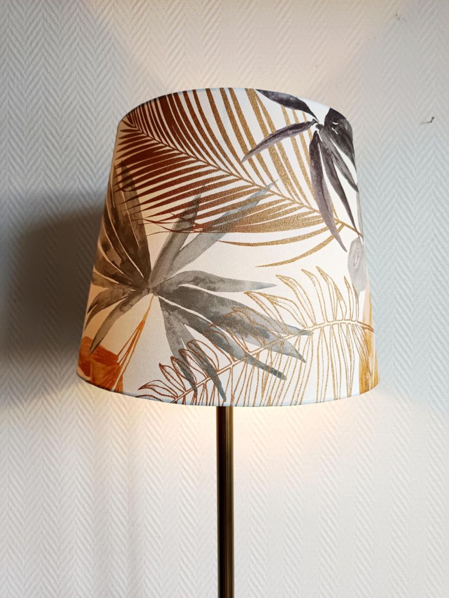 Lampadaire en métal doré dans le style Louis XV reposant que trois pieds de spirales et de coquillages. Fut cannelé, avec décoration perlée au milieu. Pour ce lampadaire a été réalisé un abat-jour sur mesure de forme empire à décor de feuillages. Les feuilles dorées faisant un beau rappel au pied.
