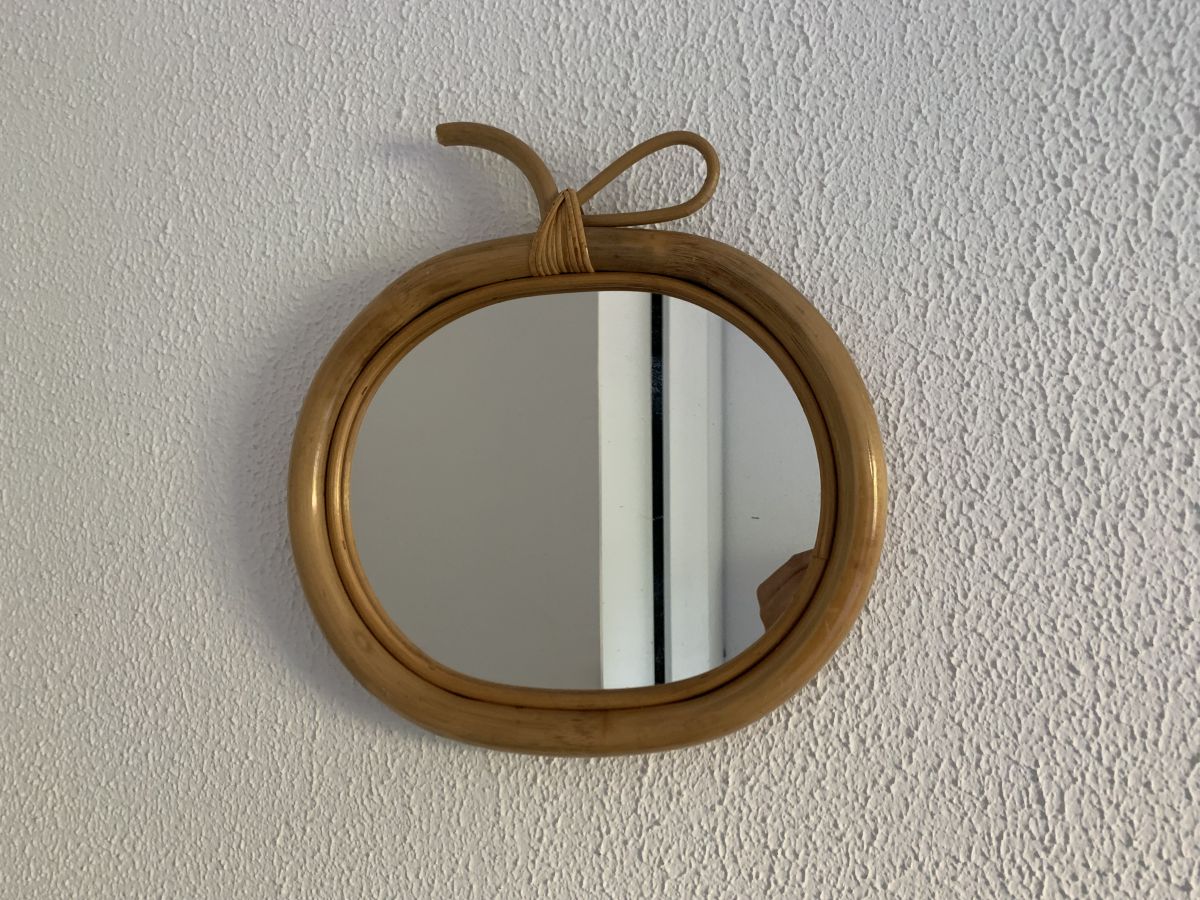 Ancien miroir pomme en rotin bambou circa 1970 en bon état.