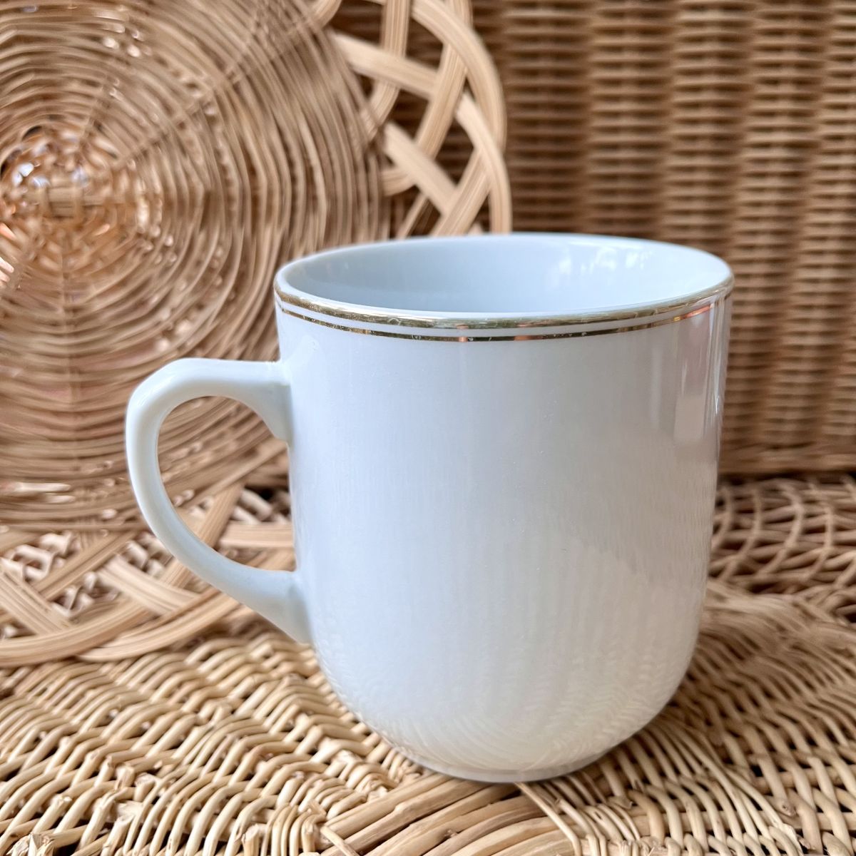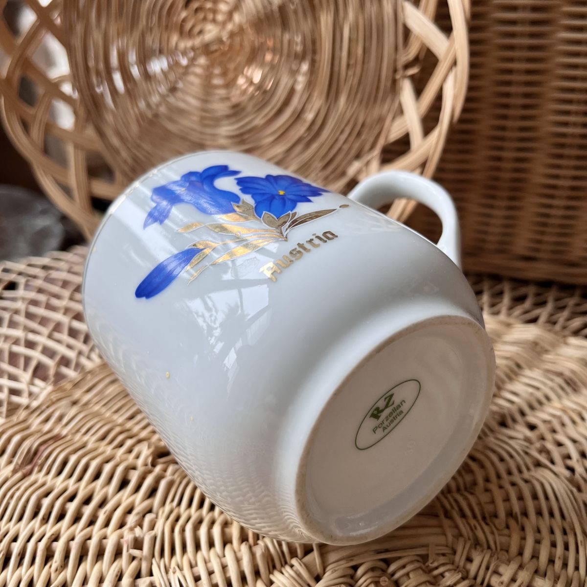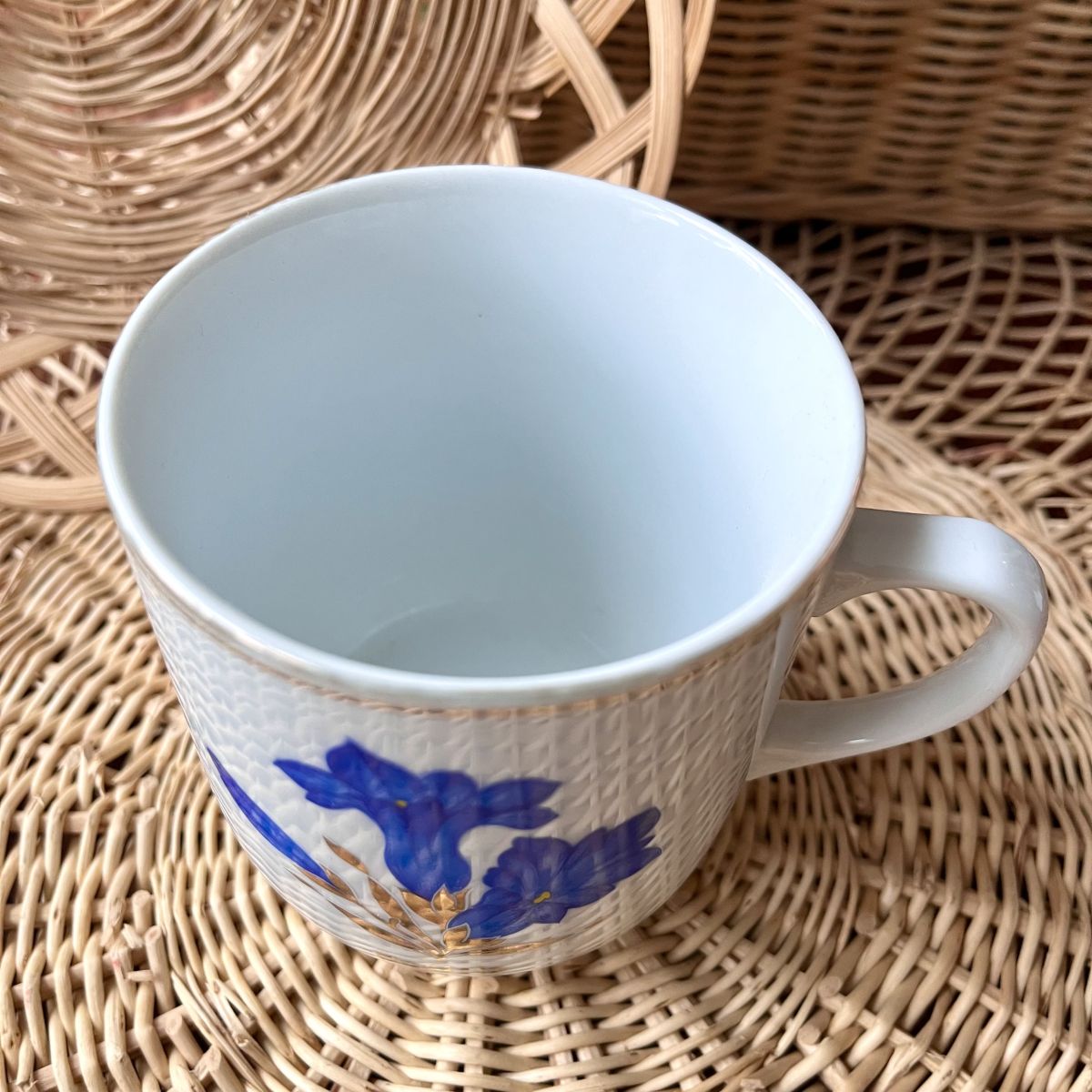 Mug ancienne ou grande tasse haute à décor bleu et or de fleur façon herbier, en porcelaine blanche éclatante.