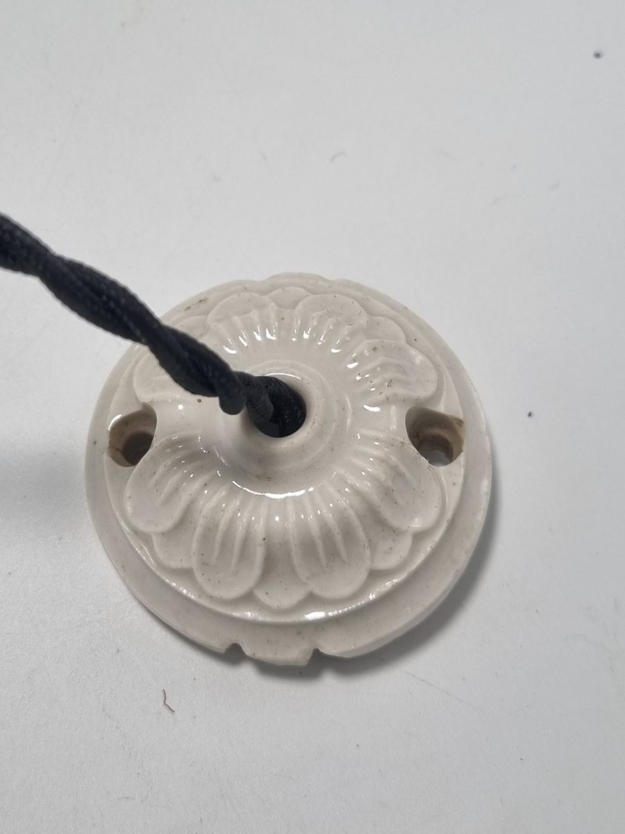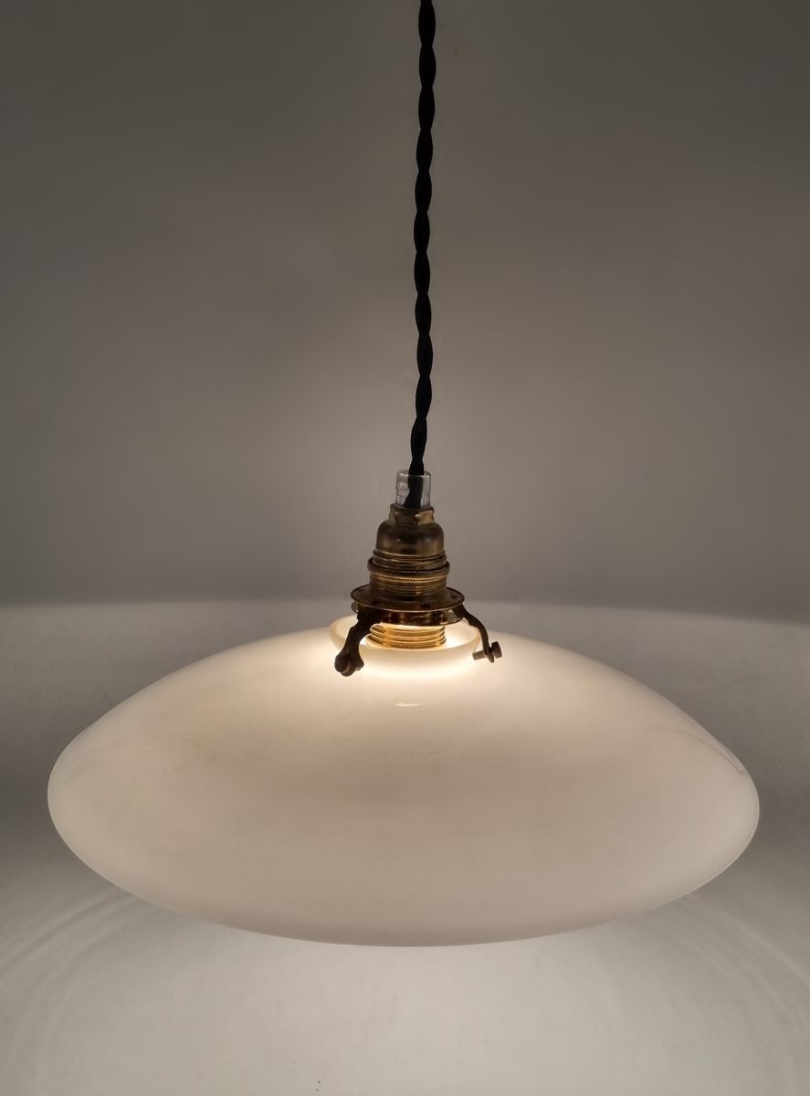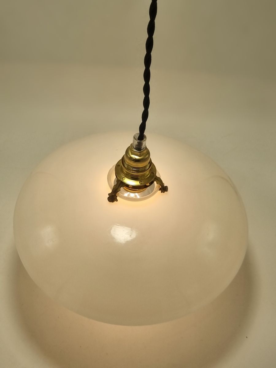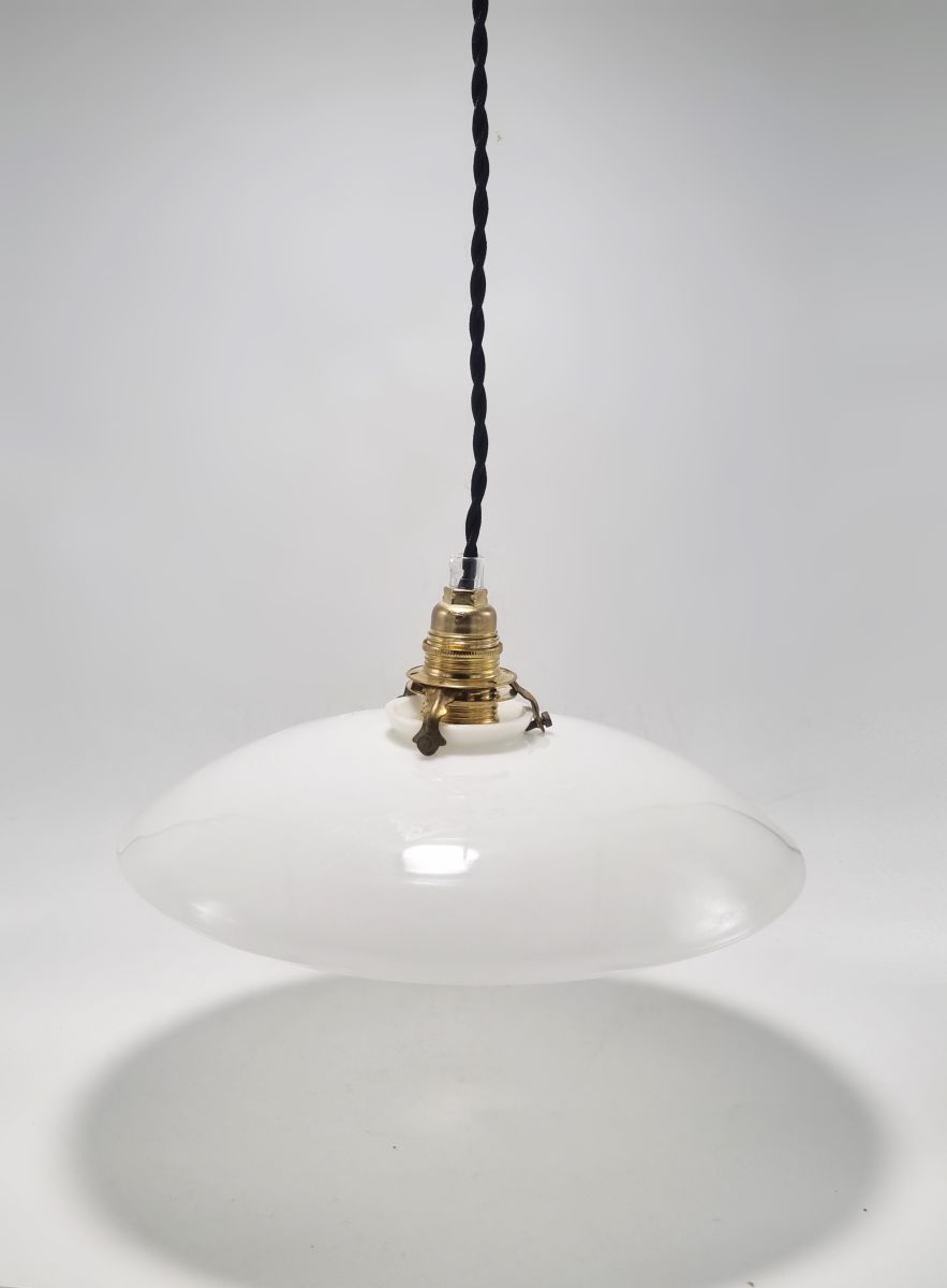 Suspension en opaline blanche, vendue avec une rosace cache-fixation en céramique blanche.